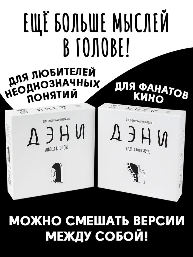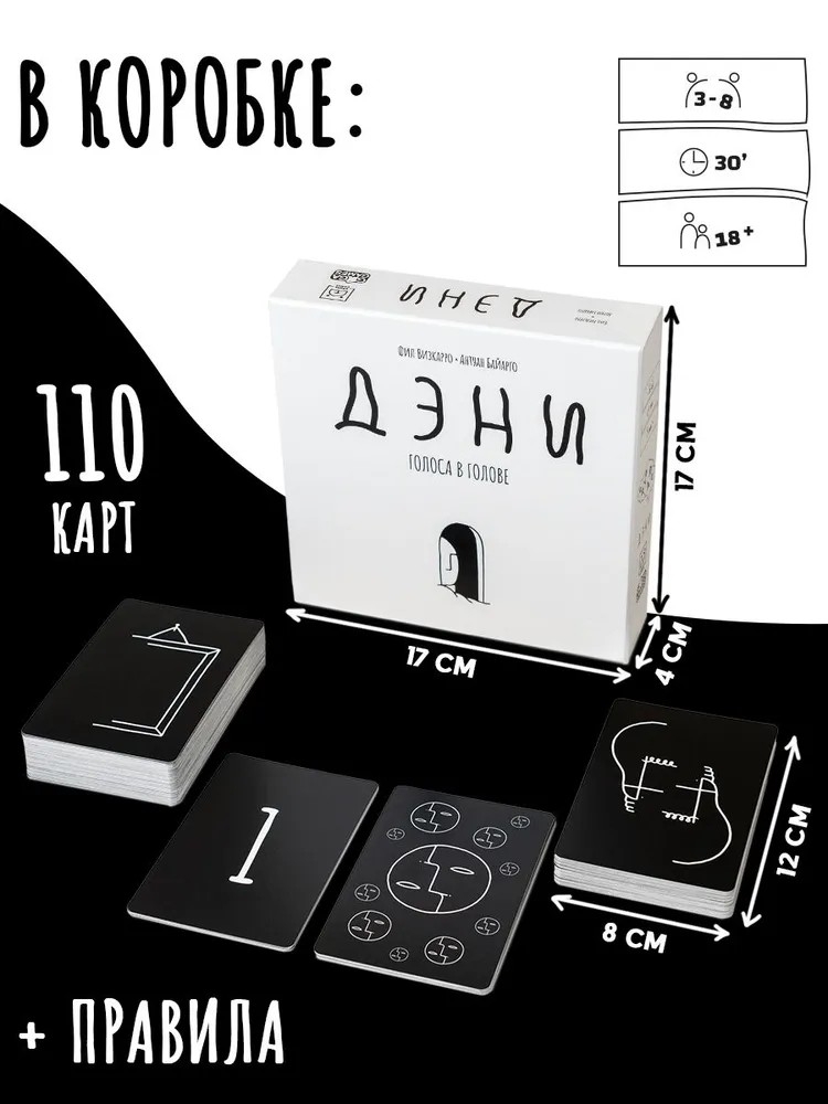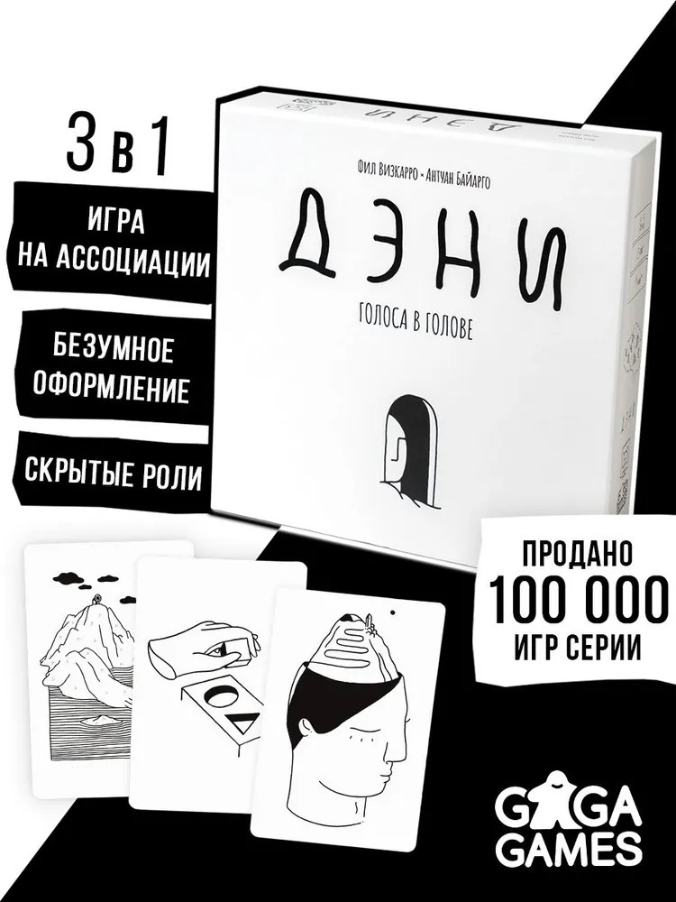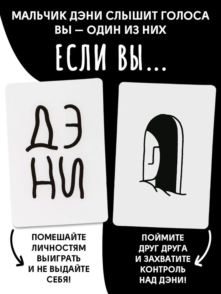 Дэни. Голоса в голове – это игра на ассоциации с сюрреалистичными изображениями и скрытыми ролями. Все игроки – это голоса в голове у мальчика по имени Дэни. Но подлинный Дэни – только один. Его задача запутать голоса, чтобы избавиться от них, а голоса в свою очередь хотят полностью подавить личность Дэни.