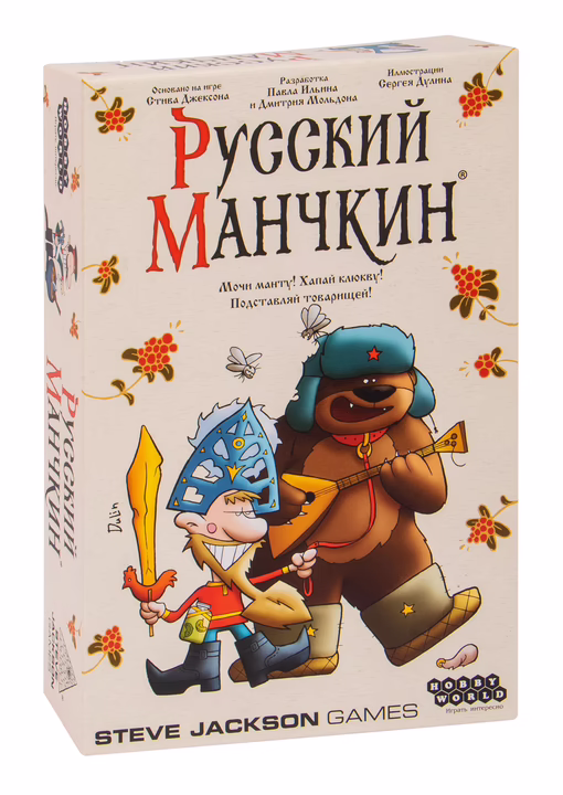 "Русский манчкин" – новая игра в популярной серии, с берёзками, балалайками и развесистой клюквой. Теперь ты можешь стрелять по монстрам из блинноствольного ружья, не слезая с печи и держа ручного медведя за поводок. Ты больше не жалкий дварф или клирик – теперь ты грозный хакер, влиятельный олигарх и неудержимый олимпийский чемпион, в кирзачах-скороходах и с группой крови на рукаве.