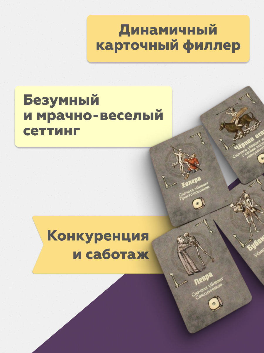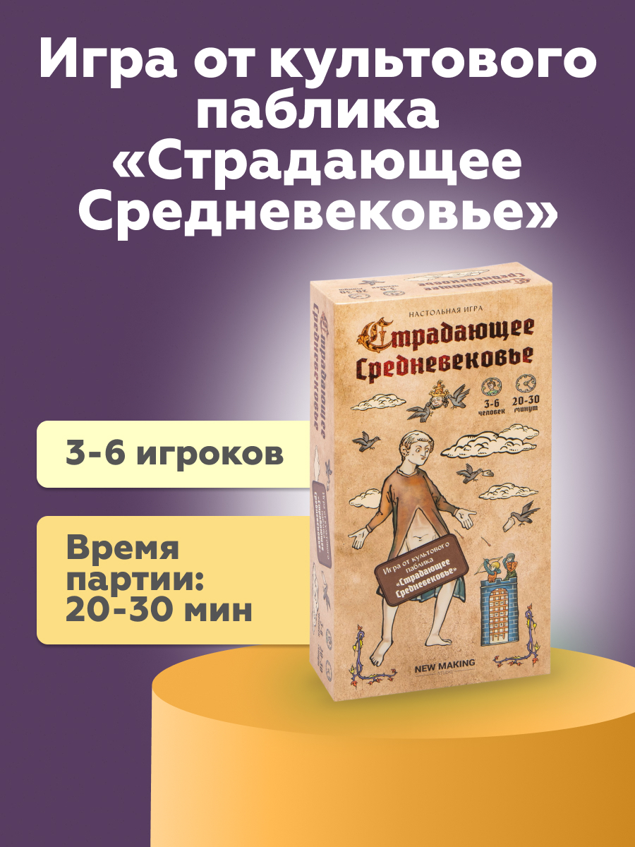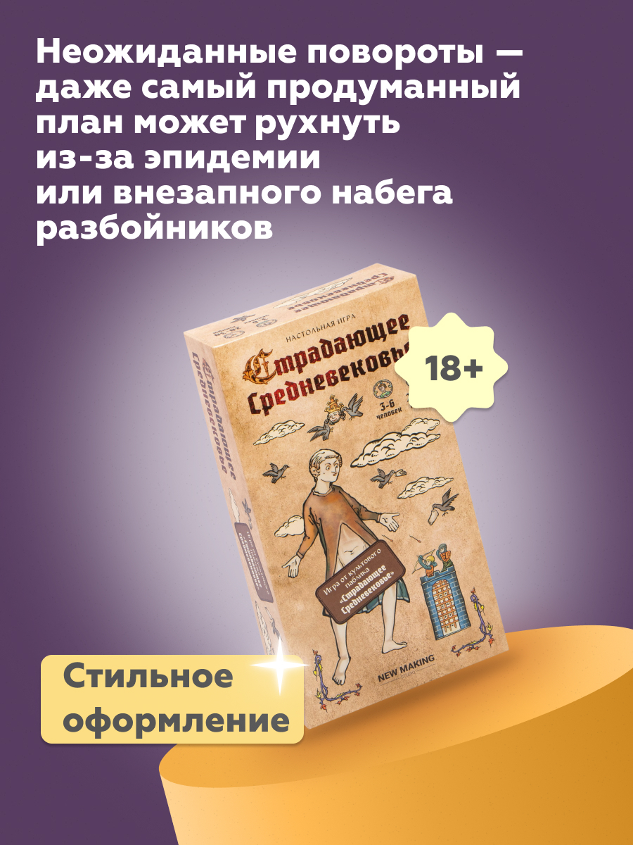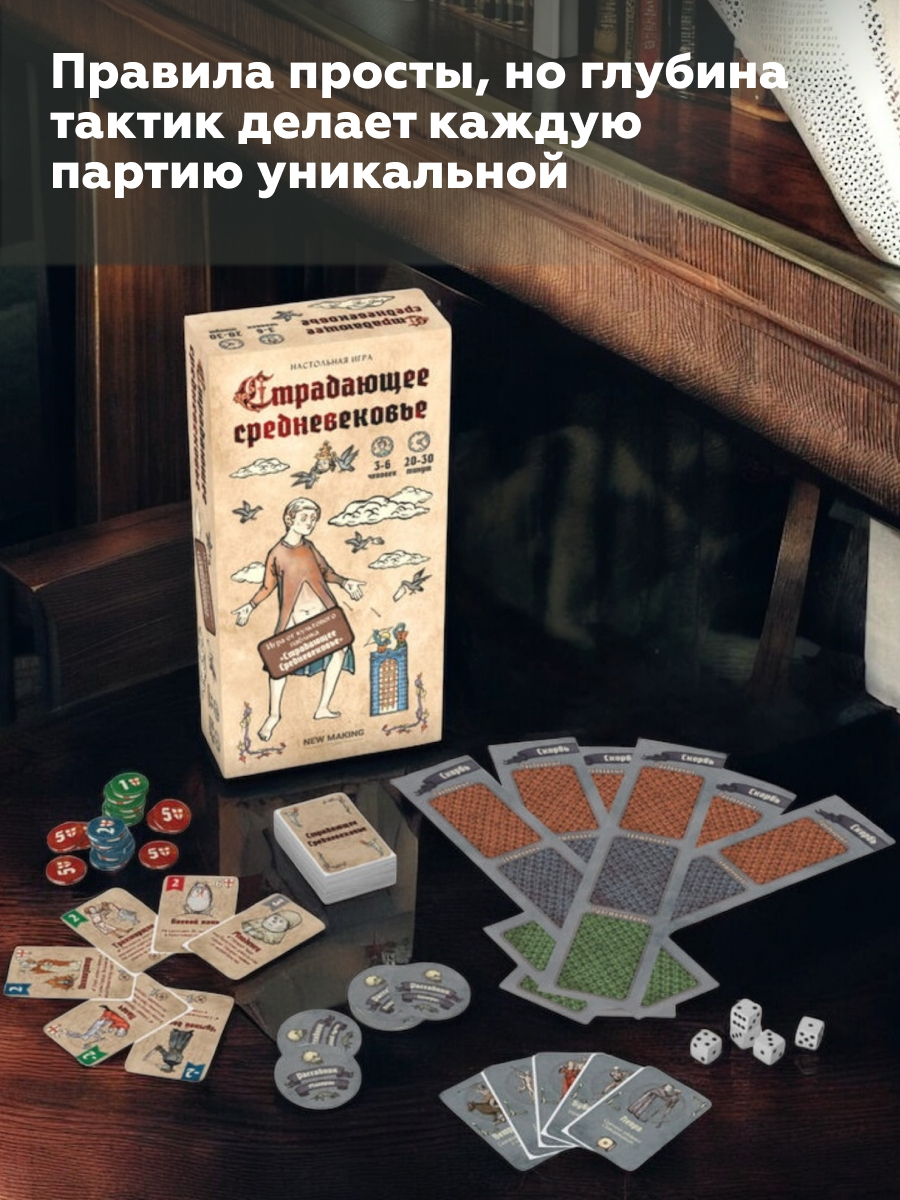 "Страдающее Средневековье" – это безумный и весёлый карточный филлер, который научит вас как правильно страдать от чумы, крестовых походов и инквизиции. Костры инквизиции всё ещё горят, крысы разносят болезни, палачи и разбойники точат ножи, а простолюдины жаждут зрелищ и вина.