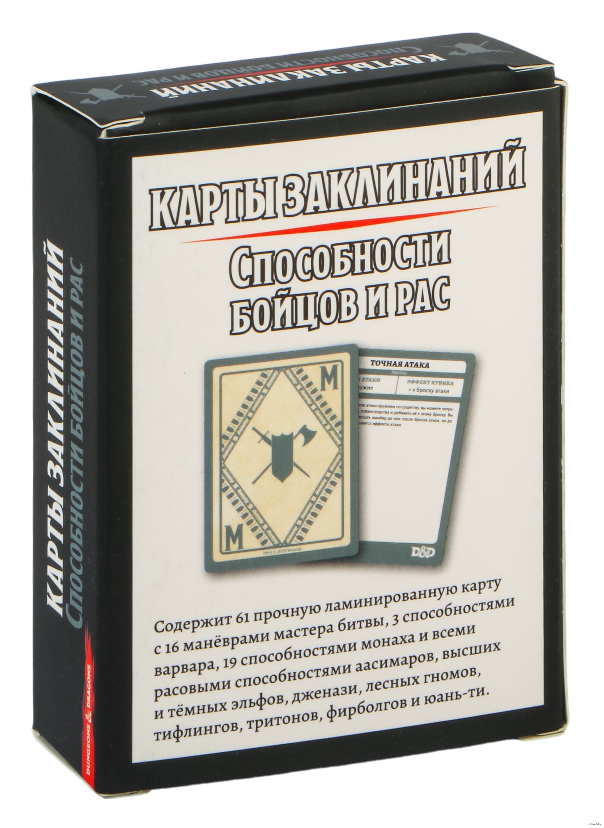 Не все могут творить заклинания, но у каждого класса есть свои особенности и способности, которые они применяют в приключениях и битвах. Этот набор карт содержит все бойцовские способности для классов: Варвар, Монах, Воин. Боевые манёвры, техники и многое другое для тех, кто предпочитает рукопашное сражение, а не хитроумные заклинания.