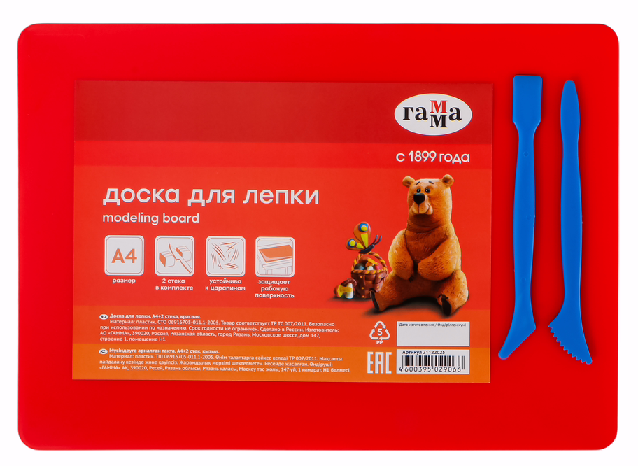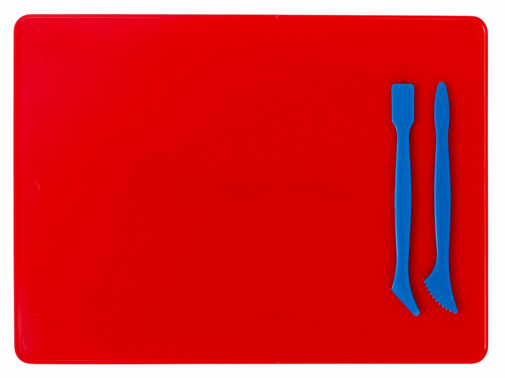 Доска для лепки изготовлена из пластика красного цвета, материал устойчив к царапинам.