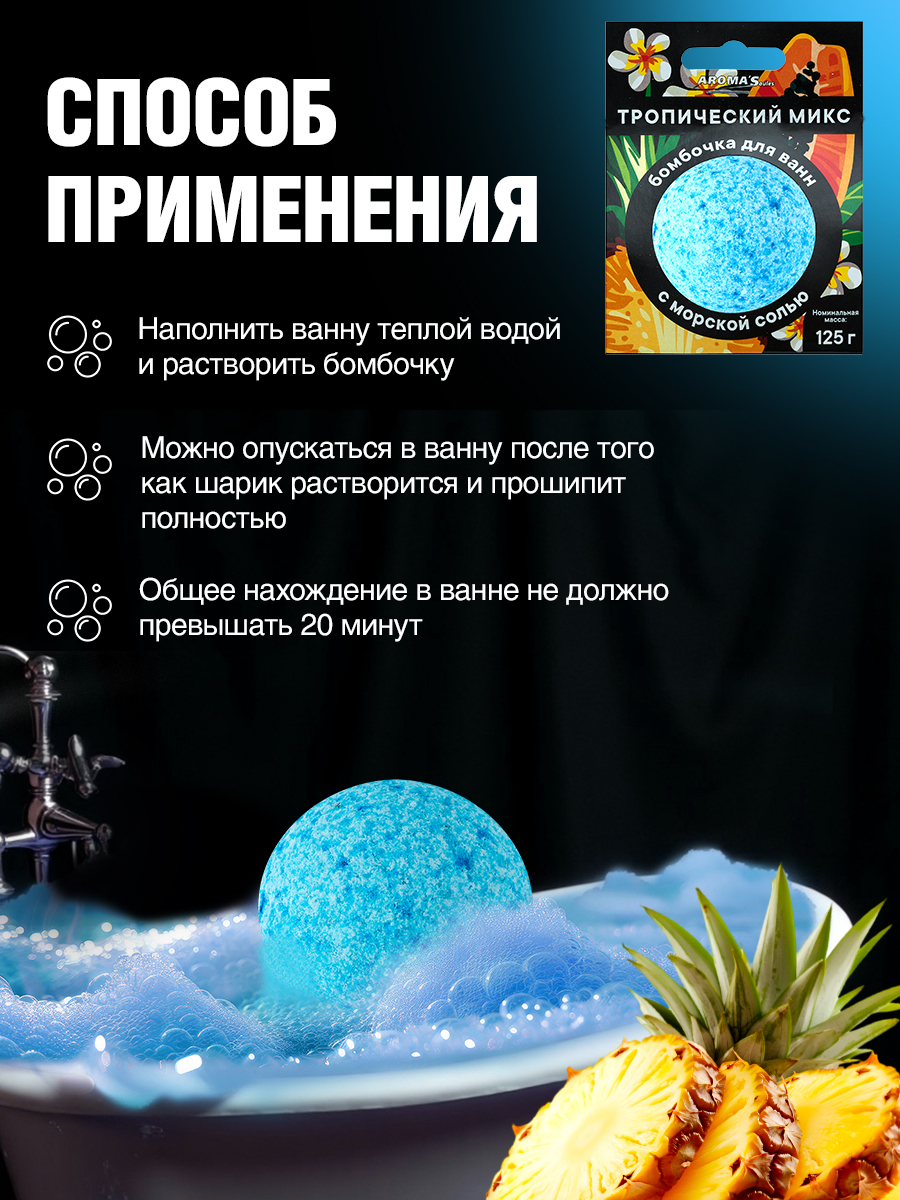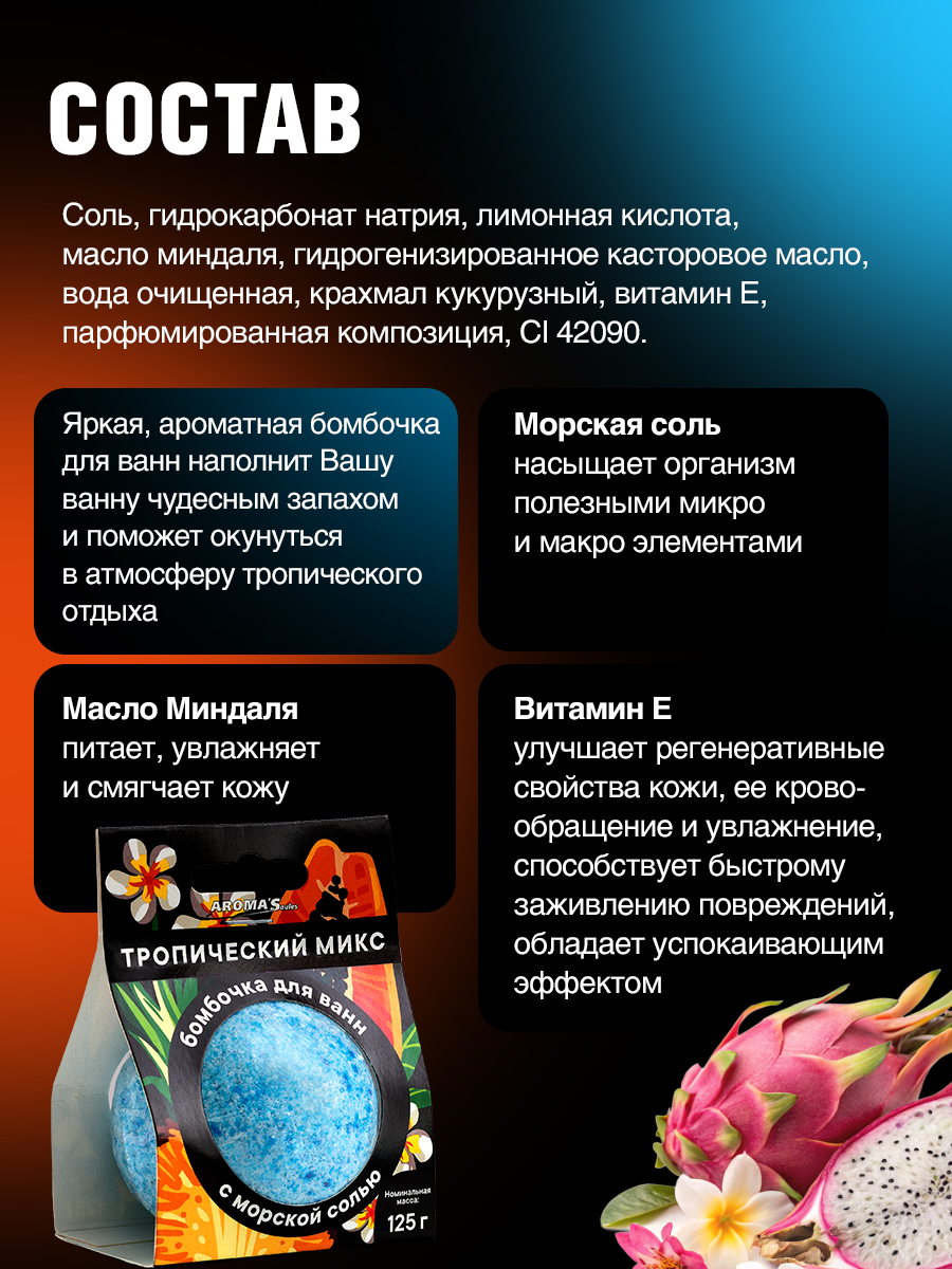 Яркая, ароматная и активно бурлящая бомбочка для ванн с ароматом тропика наполнит Вашу ванну чудесным запахом и поможет окунуться в атмосферу тропического отдыха.