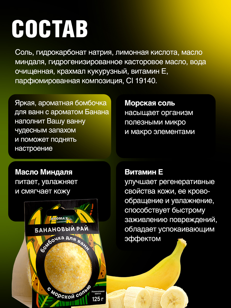 Яркая, ароматная и активно бурлящая бомбочка для ванн с ароматом Банана наполнит Вашу ванну чудесным запахом и поможет поднять настроение.