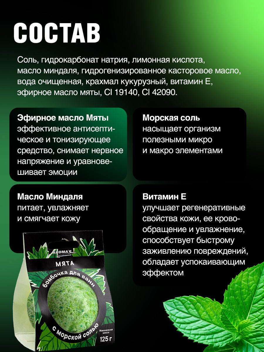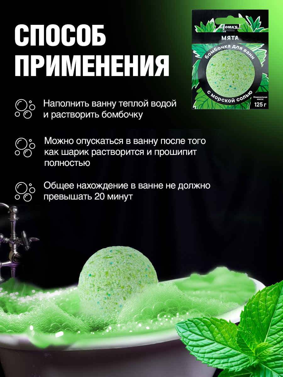 Яркая, ароматная и активно бурлящая бомбочка для ванн с ароматом Мяты наполнит Вашу ванну чудесным запахом.