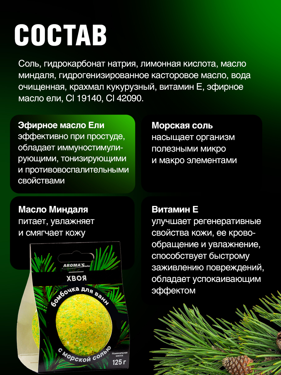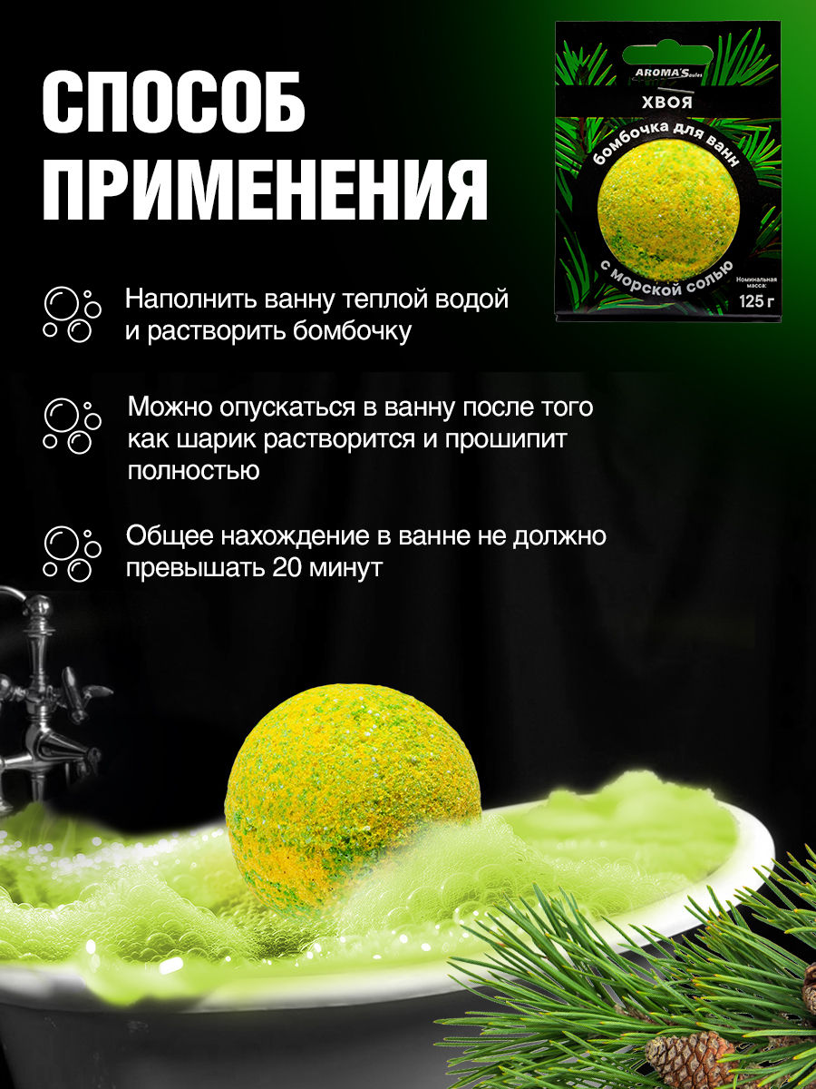 Яркая, ароматная и активно бурлящая бомбочка для ванн с Хвойным ароматом наполнит Вашу ванну чудесным запахом.