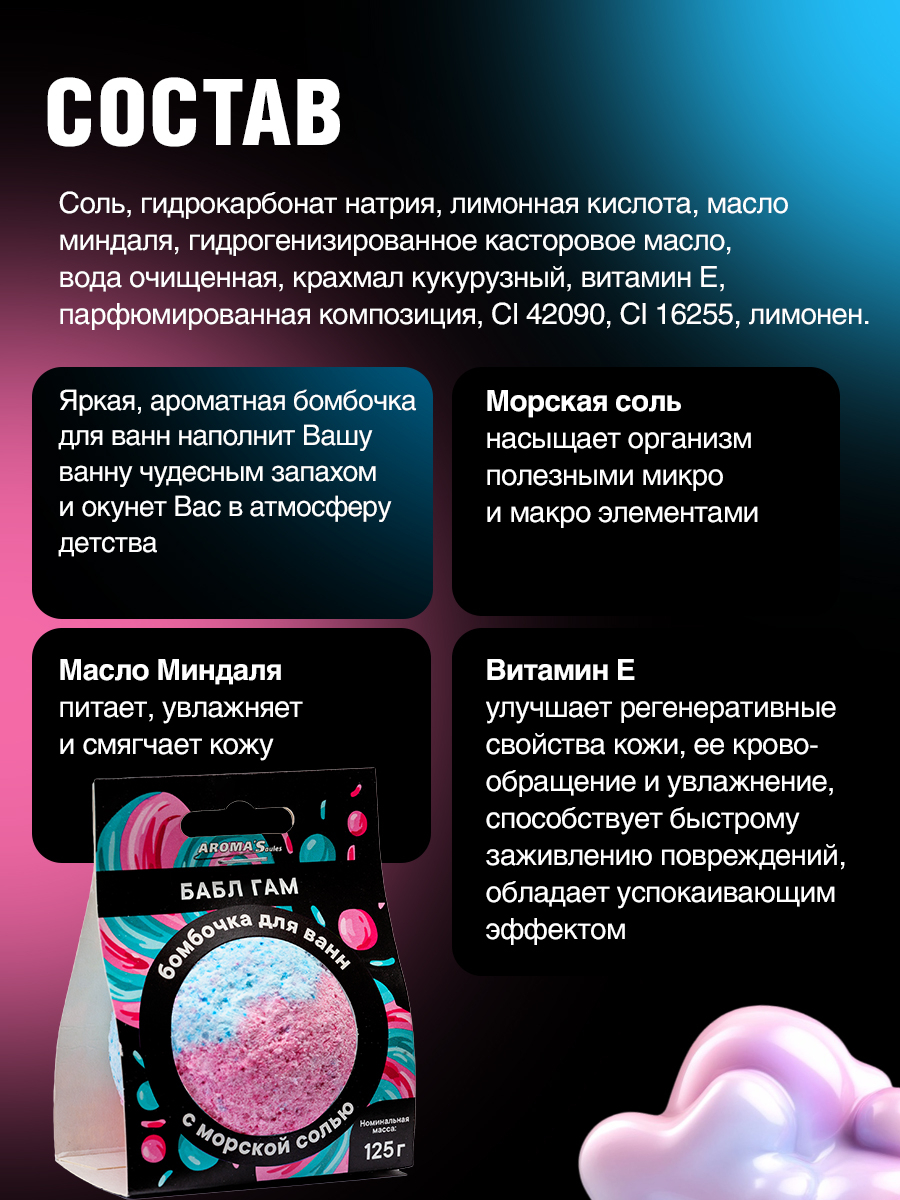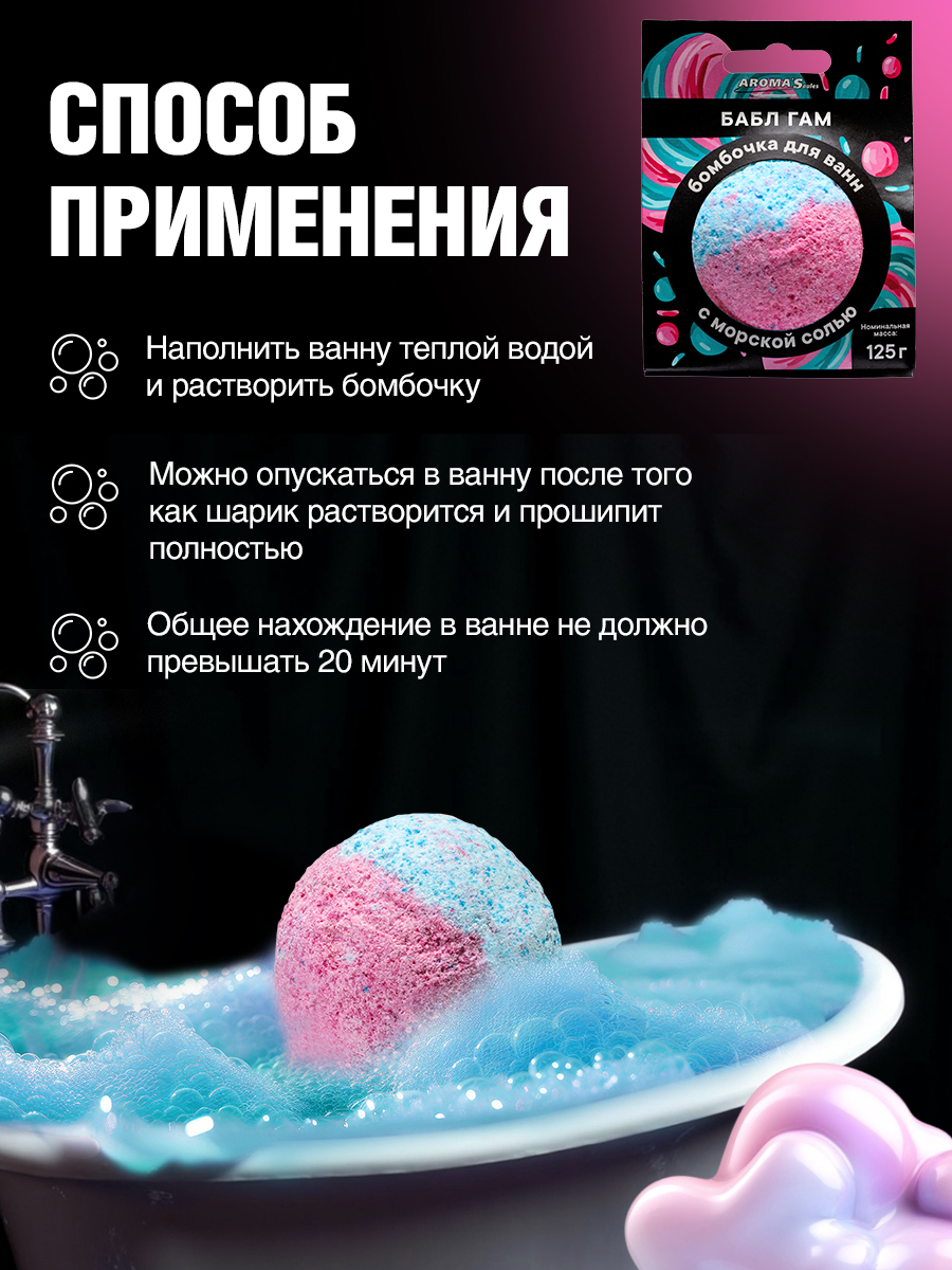 Яркая, ароматная и активно бурлящая бомбочка для ванн с ароматом бабл гама наполнит вашу ванну чудесным запахом и окунет вас в атмосферу детства.