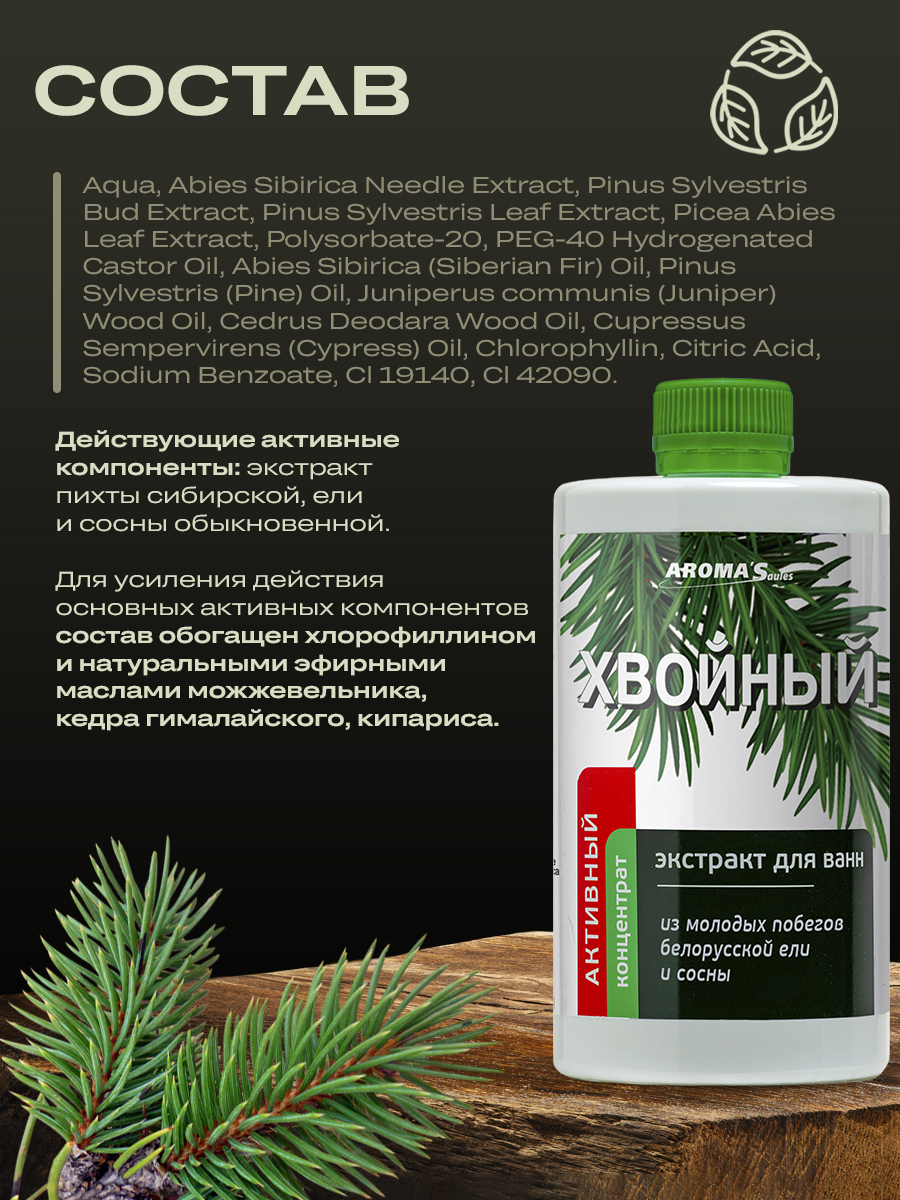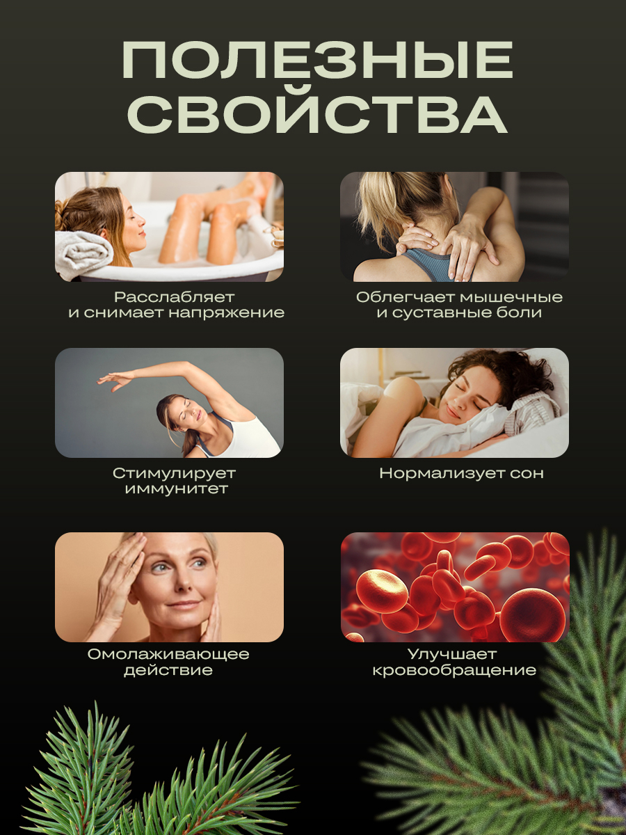 Входящие в состав экстракты пихты, сосновых почек и ели обладают освежающими, общеукрепляющими и расслабляющими свойствами, так же снимая усталость и восстанавливая защитные силы организма.
