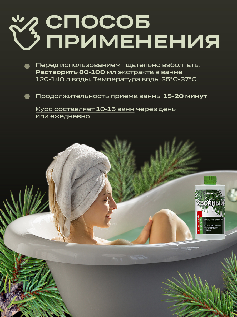 Перед использованием тщательно взболтать. Растворить 80-100 мл экстракта в ванне 120-140 л воды. Температура воды 35°С-37°С. Продолжительность приема ванны 15-20 мин. через день или ежедневно. Курс составляет 10-15 ванн.Состав