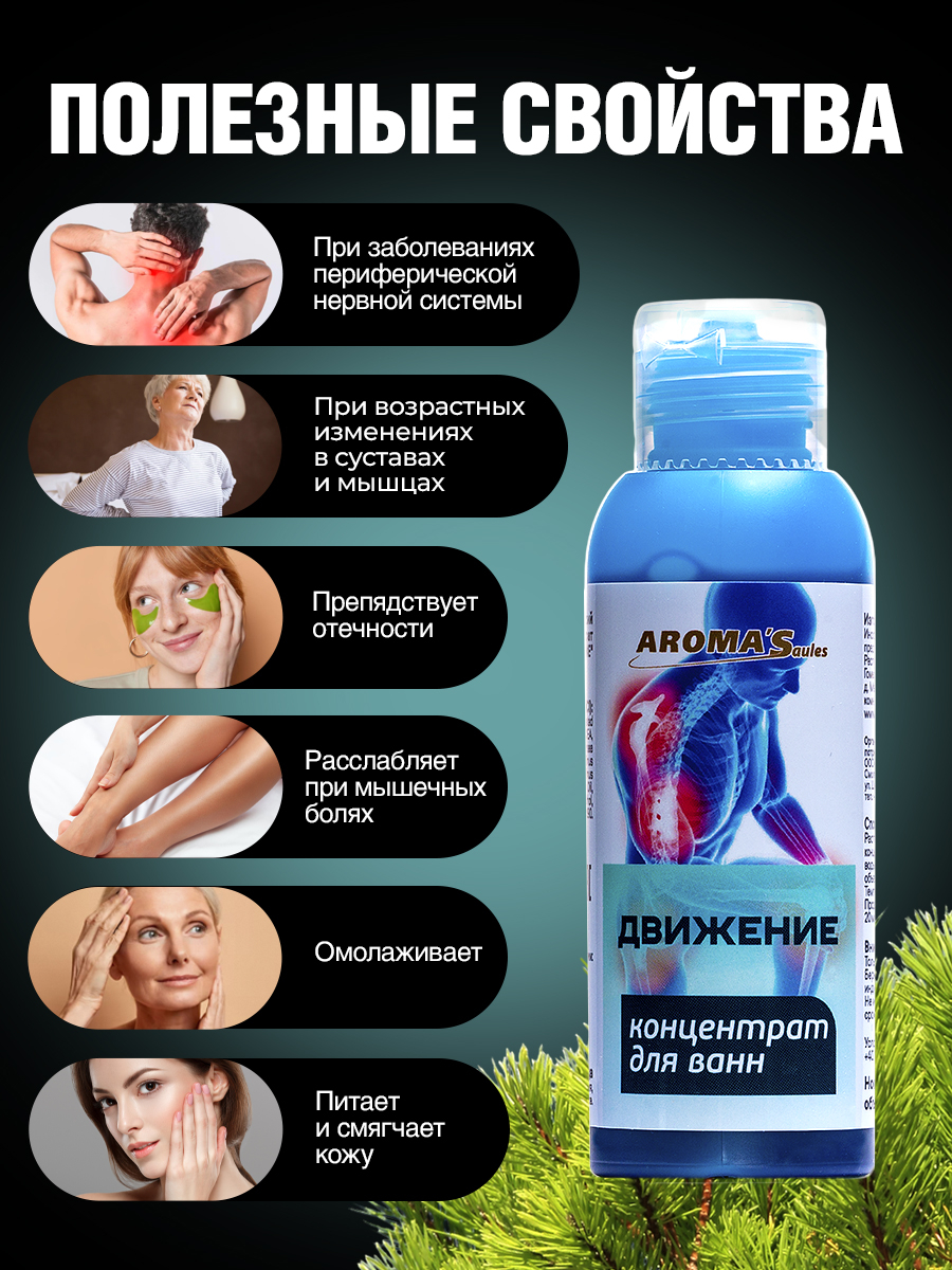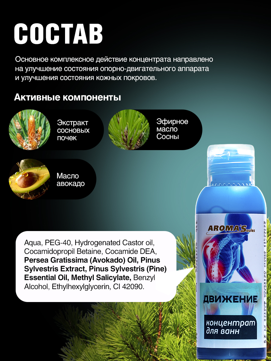 Концентрат на основе метилсалицилата в составе с хвойными эфирными маслами и натуральным растительным маслом авокадо под воздействием тепла стимулируют кожное кровообращение, что приводит к расслаблению мускулатуры при мышечных напряжениях и жалобах ревматического характера. Метилсалицилат рекомендован при растяжении мышц, терапии заболеваний опорно-двигательного аппарата и периферической нервной системы: "суставном синдроме", ревматических болях, радикулите, невралгии, артритах, боли в суставах, при нарушении кровообращения, травмах опорно-двигательного аппарата. Хвойные масла используются в медицине как местнораздражающее, антисептическое, противовоспалительное, анальгезирующее средство. Эфирное масло хвои сосны местно раздражает рецепторы кожных покровов, уменьшает боль, улучшает кровообращение..