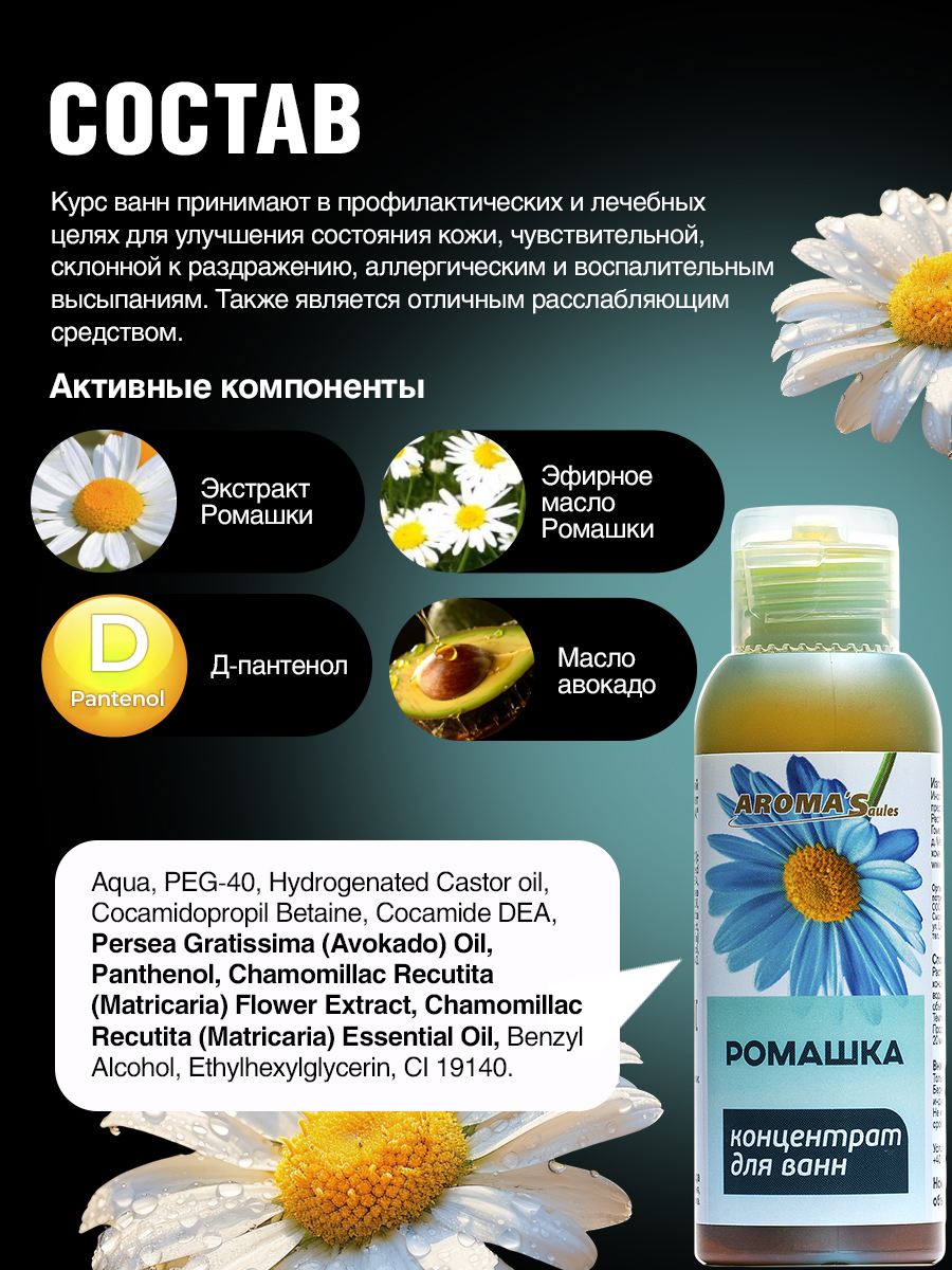 Сочетание натурального растительного масла авокадо, экстракта ромашки и эфирного масла ромашки аптечной обеспечивает прекрасный уход за телом, улучшает состояние кожного покрова при чувствительной, склонной к раздражениям коже. Ускоряет заживление и восстановление поврежденных тканей.