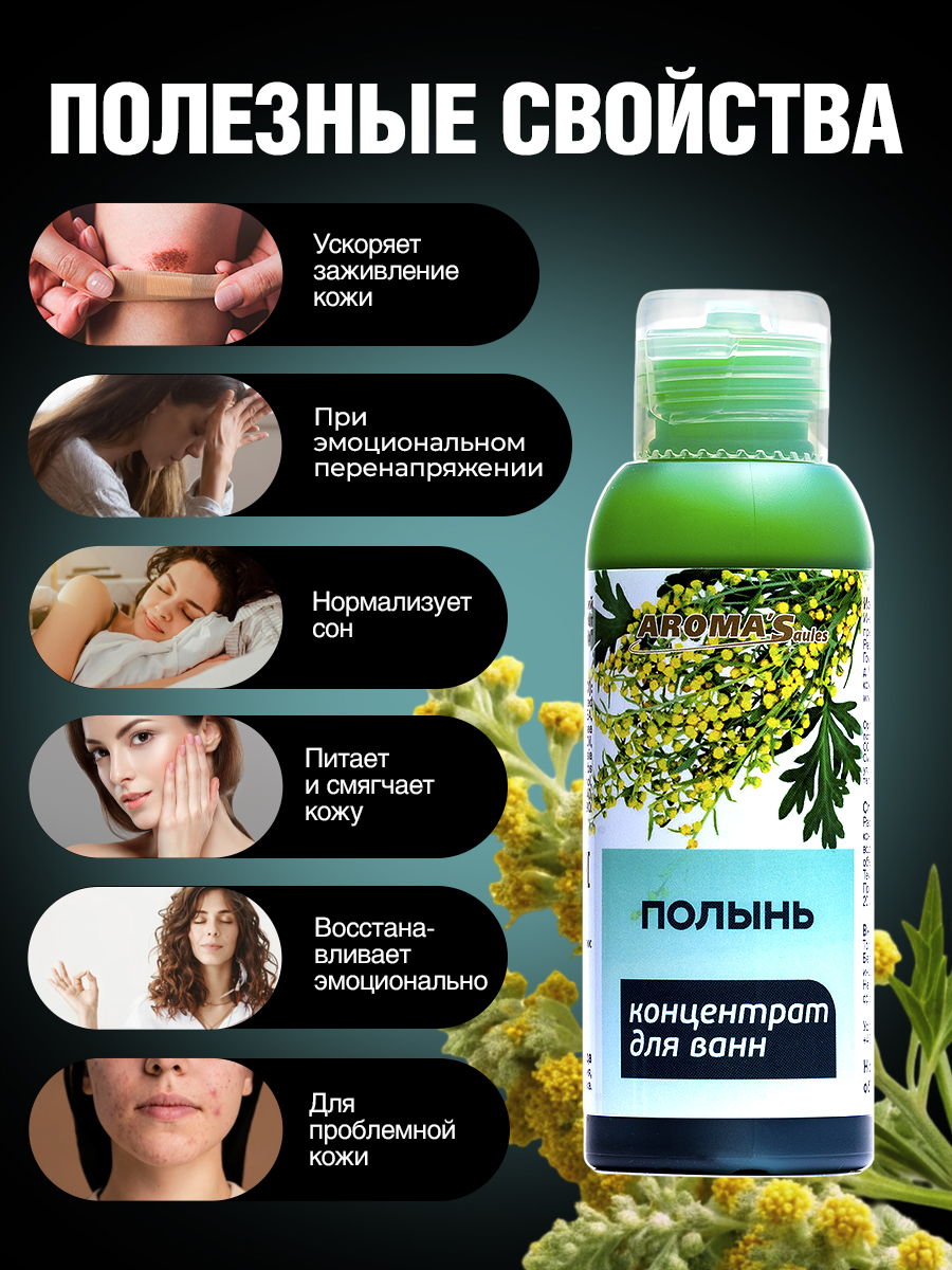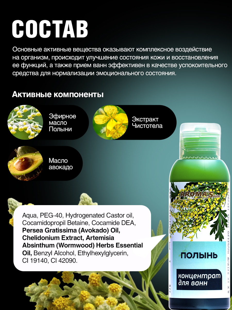 Сочетание масла авокадо, экстракта чистотела и эфирного масла полыни благотворно влияет на организм человека в целом, а также прекрасно помогает при проблемах с кожей. Полынь горькая применяется для лечения заболеваний нервной системы в качестве успокоительного средства. Так же полезно применение полыни при стрессах, депрессии, для восстановления сна при бессоннице. Экстракт чистотела распространенное средство, которое отлично помогает при кожных заболеваниях.