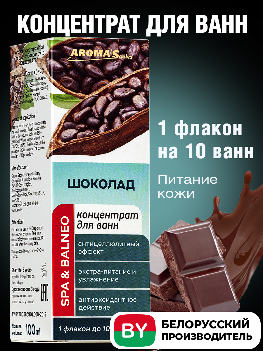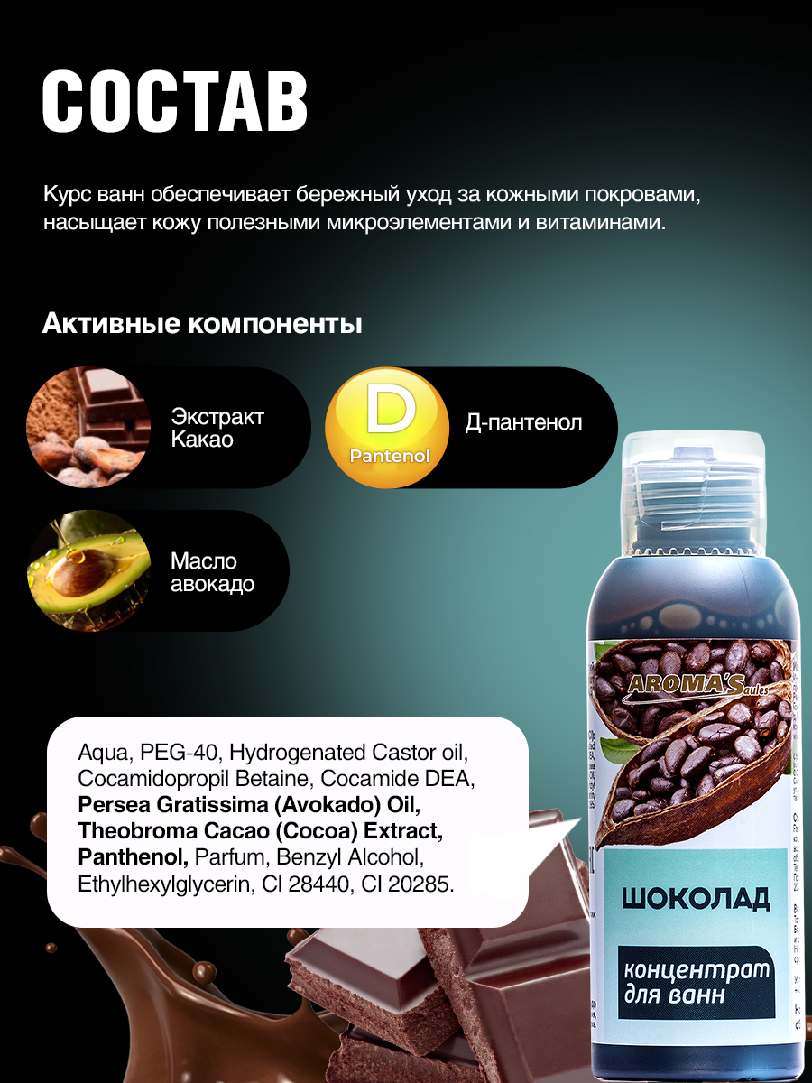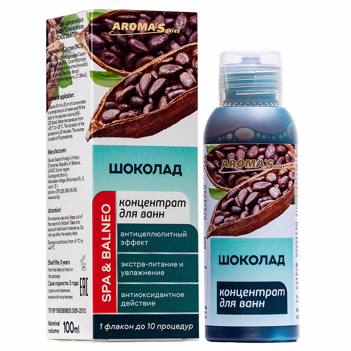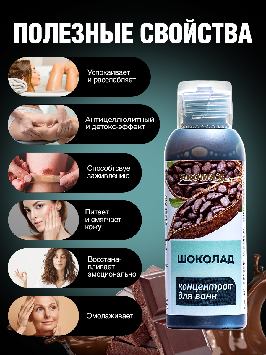 Шоколадная ванна отлично питает и увлажняет кожу. Обладает успокаивающим действием, помогает бороться со стрессом, повышает жизненную энергию, ухаживает за кожей. Прекрасный эффект для ухода за кожей обеспечивается за счёт уникального состава. Перед применением шоколадной ванны рекомендуется очистить кожу скрабом.