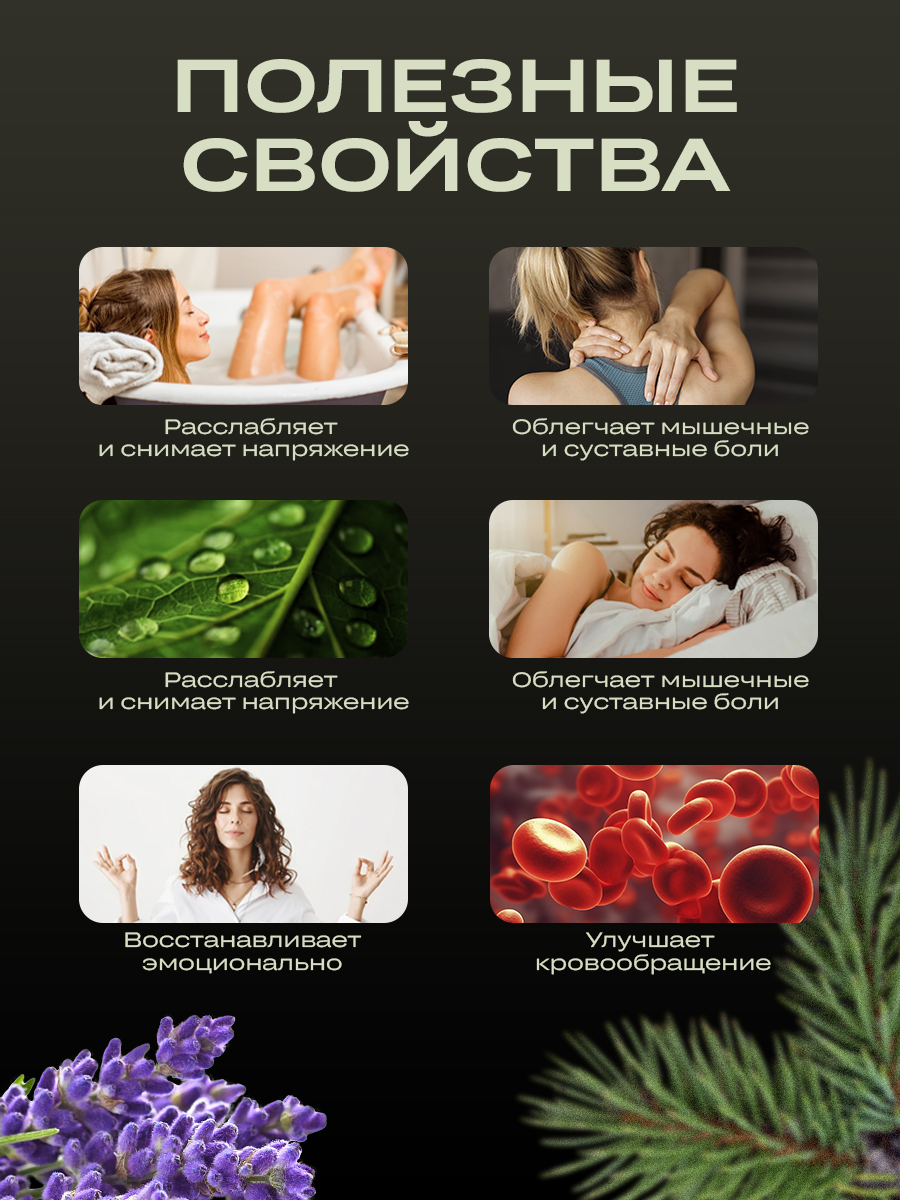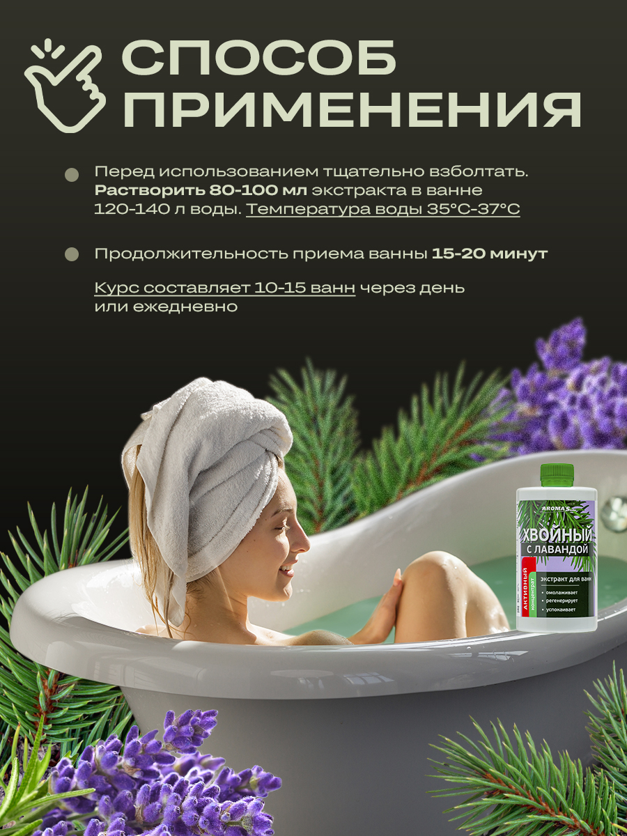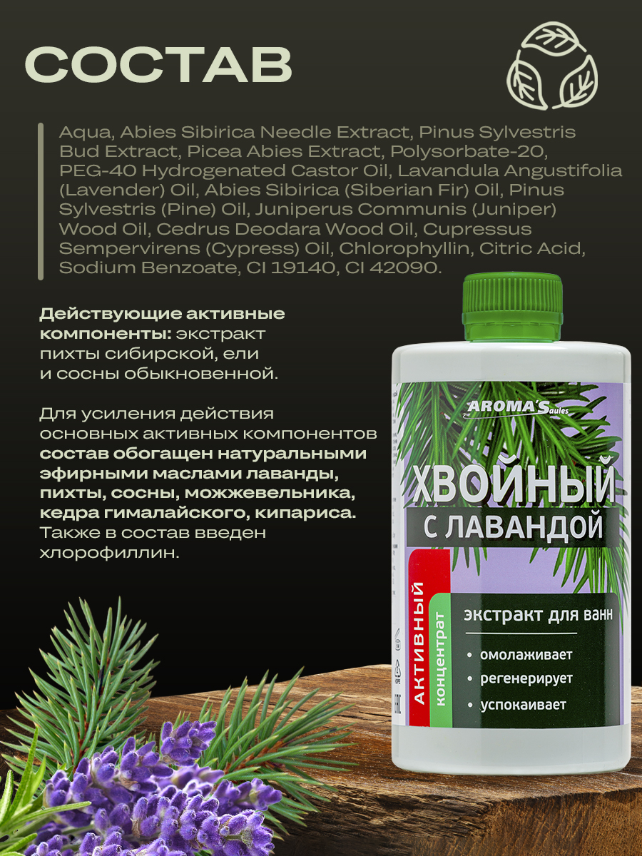Хвойный экстракт с лавандой обладает общеукрепляющими и антиоксидантными свойствами. Оказывает успокаивающее действие на организм, способствует восстановлению после переутомления, расслабляет и улучшает сон.