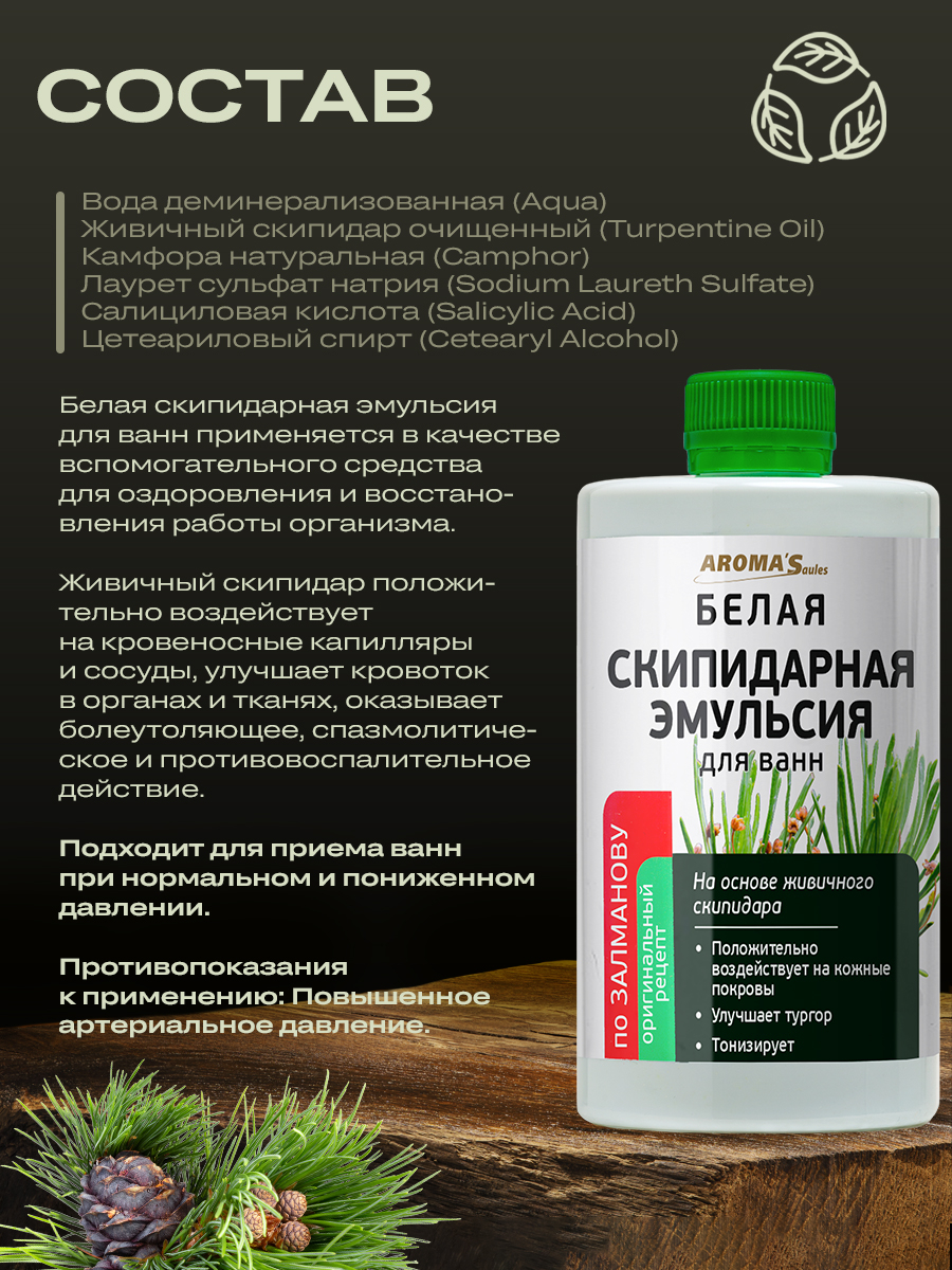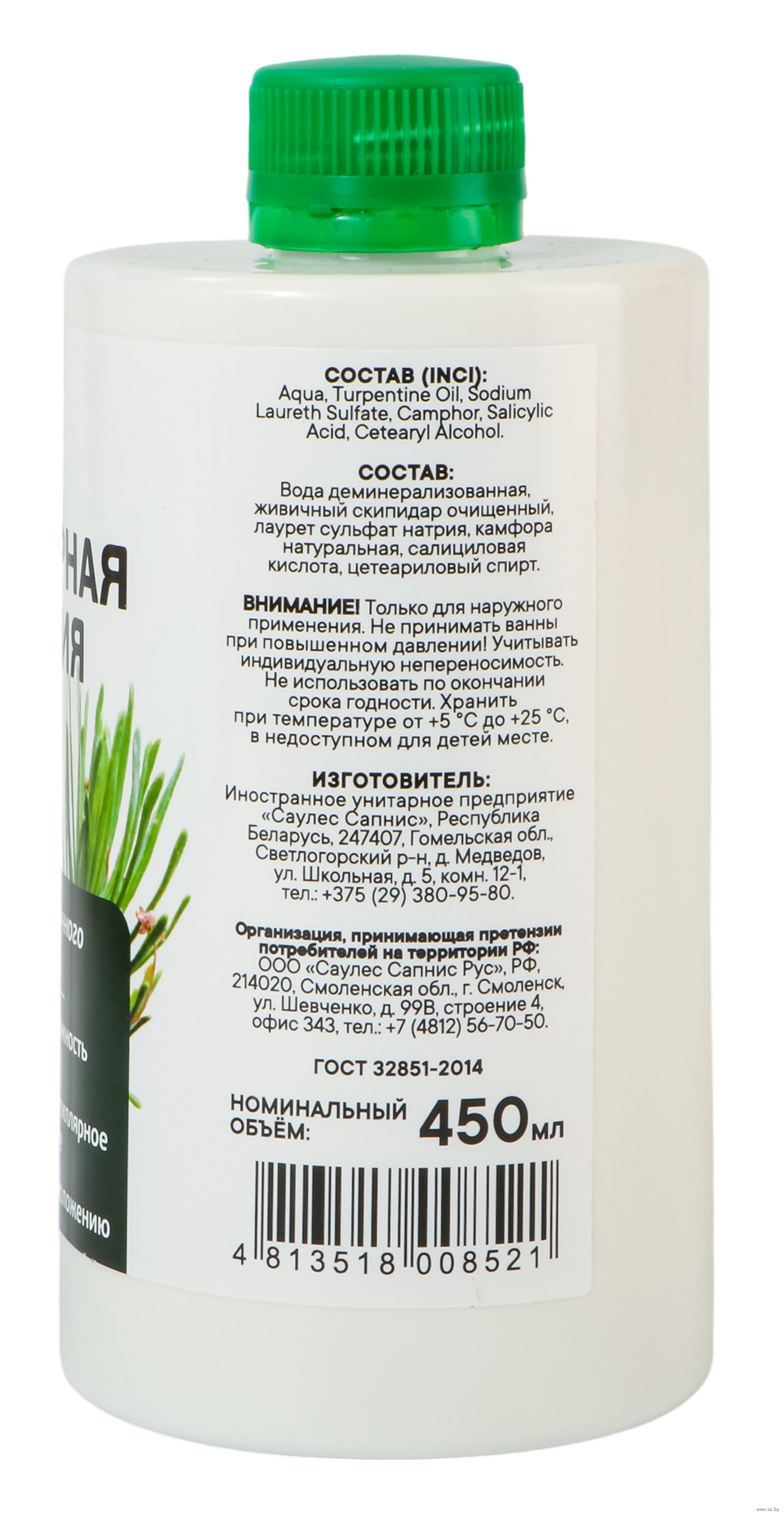 Вода деминерализованная, живичный скипидар очищенный, лаурет сульфат натрия, камфора натуральная, салициловая кислота, цетеариловый спирт. Aqua, Turpentine Oil, Sodium Laureth Sulfate, Camphor, Salicylic Acid, Cetearyl Alcohol.