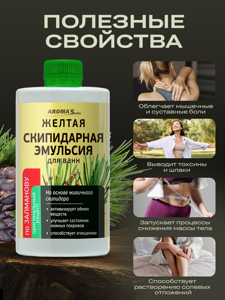Желтая скипидарная эмульсия эффективно выводит через расширенные капилляры токсины, шлаки и другие вредные вещества, запускает процессы снижения массы тела и выводит излишки жидкости из организма. В следствии того, что перераспределяется тепло в теле во время приема ванны, происходит гибель болезнетворных агентов (бактерий, вирусов) в крови, лимфе, клетках. Также способствует растворению солевых отложений в области суставов и околосуставных тканях, сухожилий, связках, капилляров и стенках сосудов.