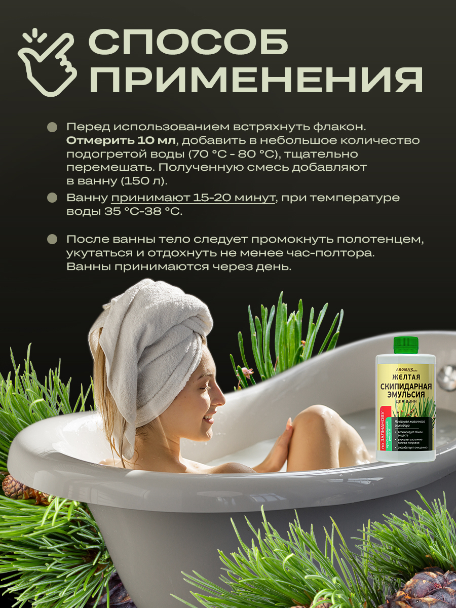Желтая скипидарная эмульсия для ванн применяется в качестве вспомогательного средства для оздоровления и восстановления работы организма. Живичный скипидар положительно воздействует на кровеносные капилляры и сосуды, улучшает кровоток в органах и тканях, оказывает болеутоляющее, спазмолитическое, противовоспалительное, регенерирующее действие. Благодаря повышению внутриклеточной температуры и активной стимуляции потоотделения.
