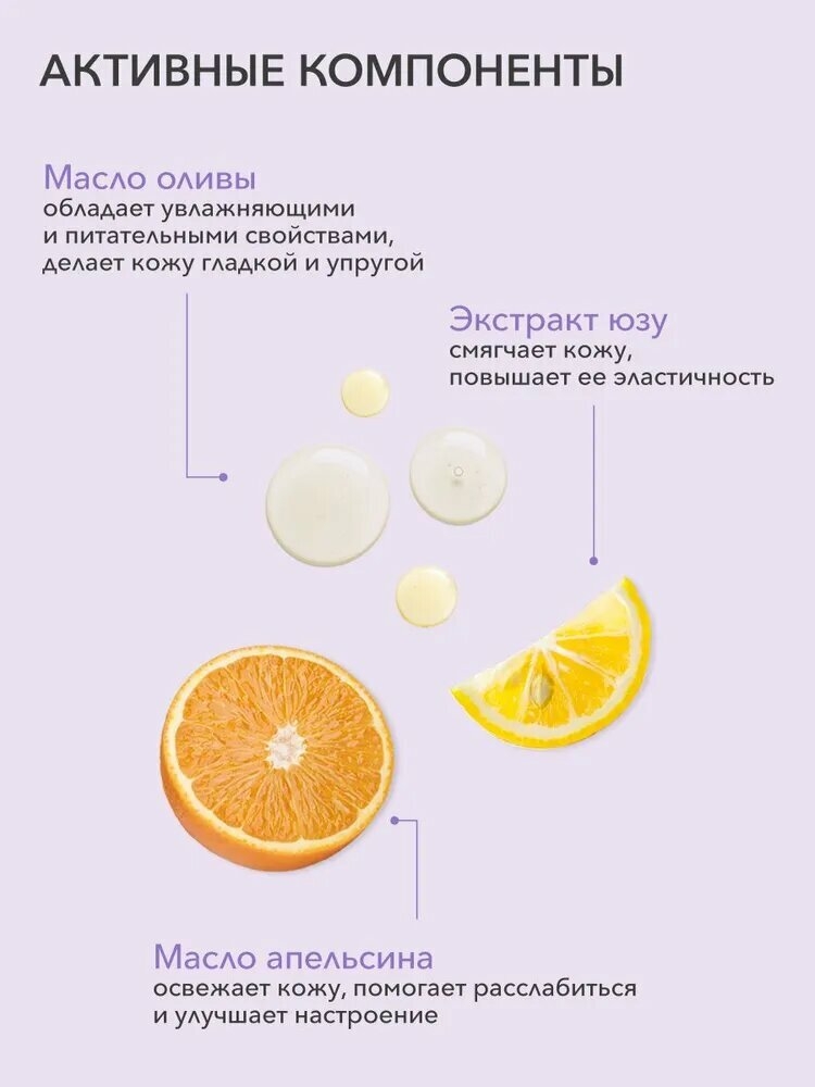 Aqua, Sodium Laureth Sulfate, Cocamidopropyl Betaine (из кокосового масла), Glycerin (растительного происхождения), PEG-120 Methyl Glucose Dioleate, Citrus Junos Fruit Extract (экстракт юзу), Olea Europaea Fruit Oil (масло оливы), Betaine (из сахарной свёклы), Xanthan Gum, Styrene/Acrylates Copolymer, Coco-Glucoside, Citrus Aurantium Dulcis Peel Oil (эфирное масло апельсина), Benzyl Alcohol, Sodium Benzoate, Potassium Sorbate, Parfum, Limonene, Linalool, Hexyl Cinnamal, CI 42090, CI 17200.