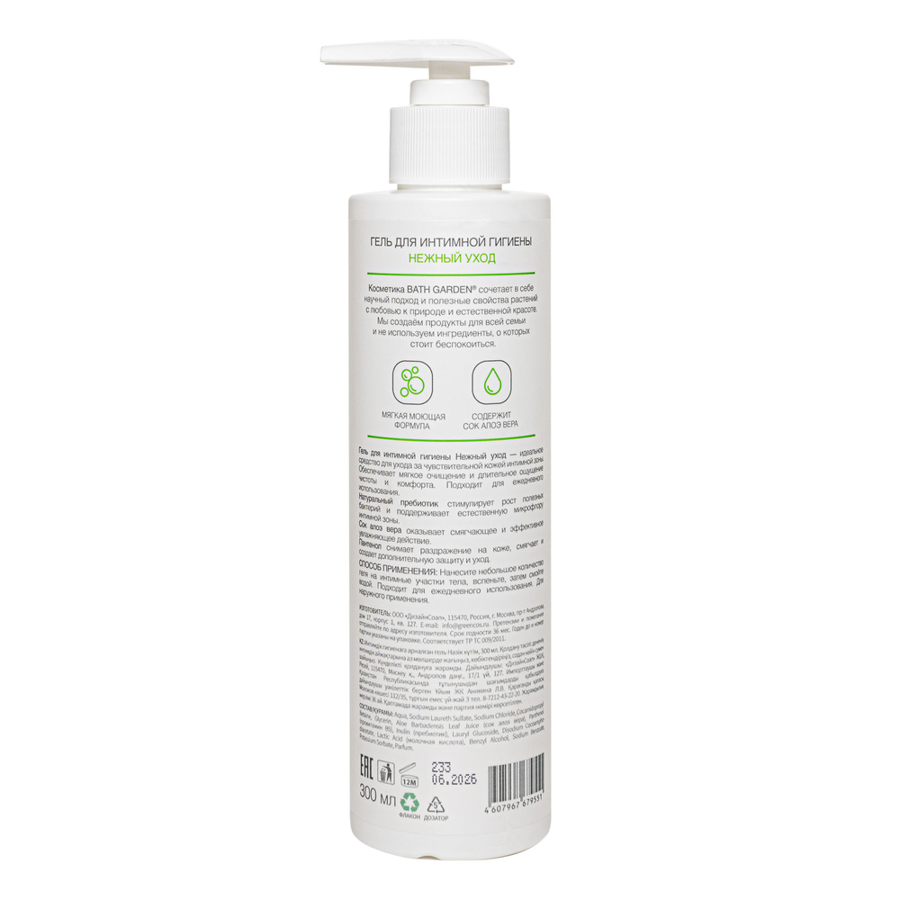 Aqua, Sodium Laureth Sulfate, Sodium Chloride, Cocamidopropyl Betaine, Glycerin, Aloe Barbadensis Leaf Juice (сок алоэ вера), Panthenol (провитамин В5), Inulin (пребиотик), Lauryl Glucoside, Disodium Cocoamphodiacetate, Lactic Acid (молочная кислота), Benzyl Alcohol, Sodium Benzoate, Potassium Sorbate, Parfum.