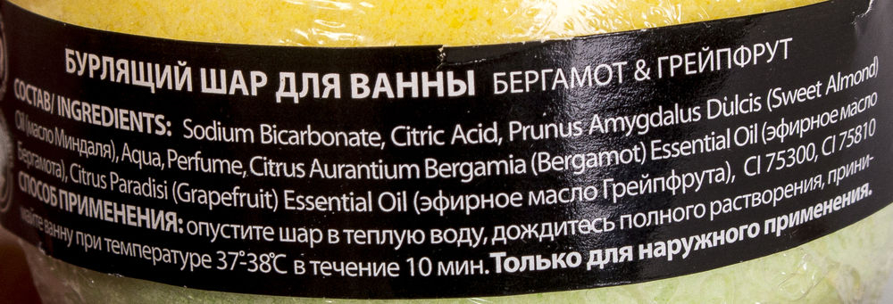 Sodium Bicarbonate, Citric Acid, Prunus Amygdalus Dulcis (Sweet Almond) Oil (масло Миндаля), Aqua, Perfume, Citrus Aurantium Bergamia (Bergamot) Essential Oil (эфирное масло Бергамота), Citrus Paradisi (Grapefruit) Essential Oil (эфирное масло Грейпфрута), СI 75300, CI 75810.