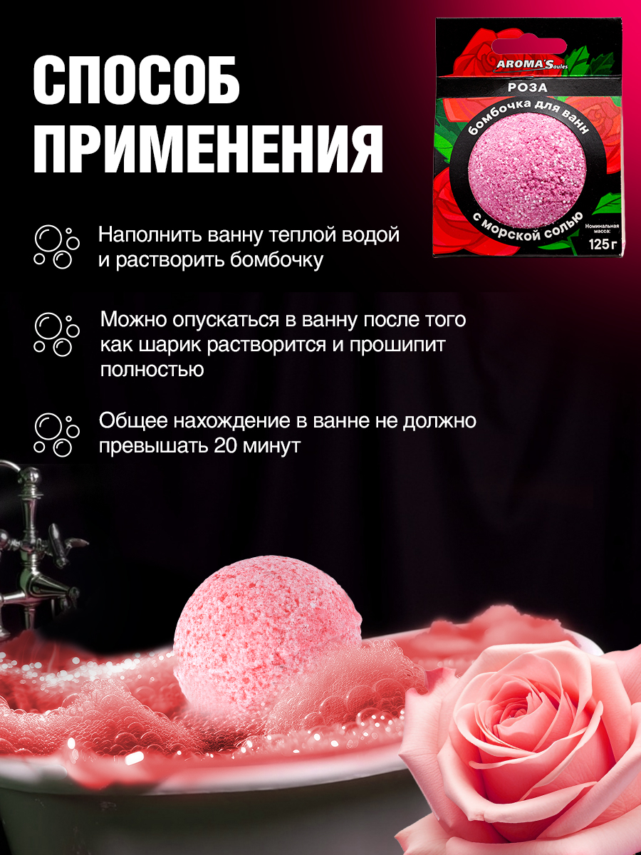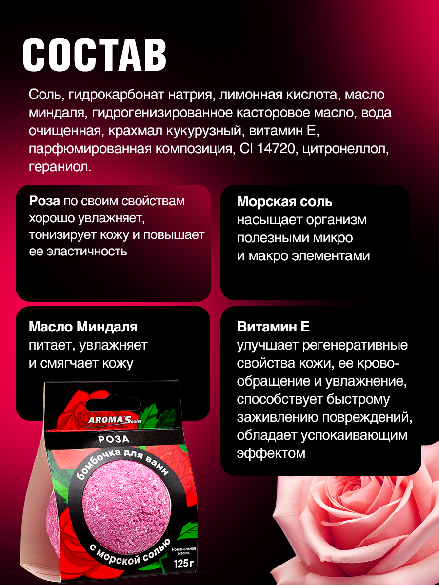 Яркая, ароматная и активно бурлящая бомбочка для ванн с ароматом Розы наполнит Вашу ванну чудесным запахом.