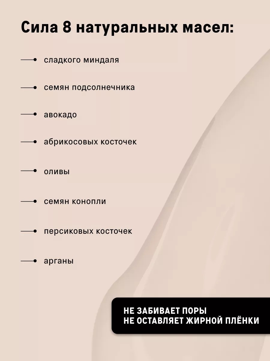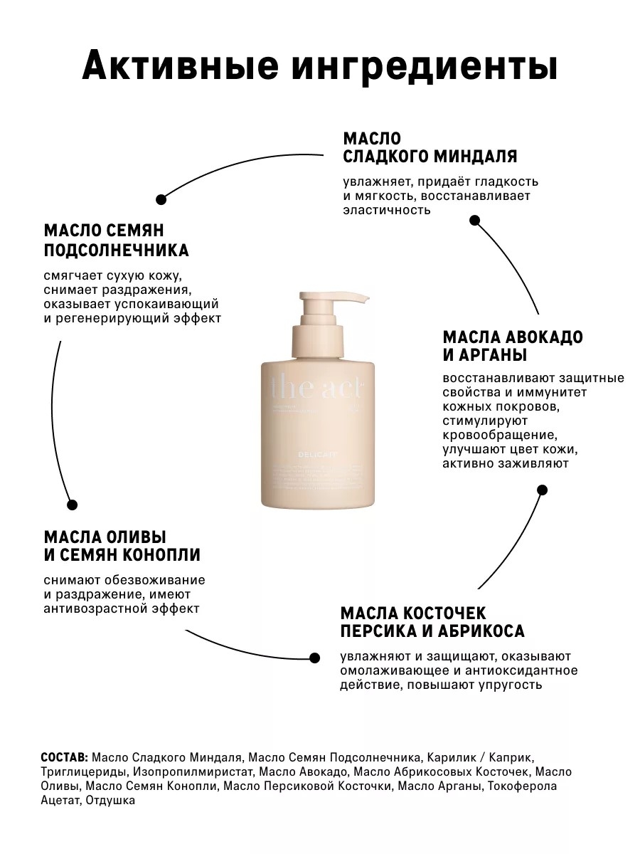 Масло Сладкого Миндаля, Масло Семян Подсолнечника, Карилик / Каприк, Триглицериды, Изопропилмиристат, Масло Авокадо, Масло Абрикосовых Косточек, Масло Оливы, Масло Семян Конопли, Масло Персиковой Косточки, Масло Арганы, Токоферола Ацетат, Отдушка.