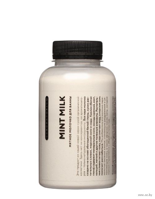 Молочко создано на основе обогащенной белой глины, сухих растительных сливок, морской соли и соды. Каолин (белая глина) содержит минеральные соли, оксиды кремния, азот, кальций, магний и другие полезные элементы. Растительные сливки питают кожу, сода смягчает воду, а морская соль помогает расслабиться. В это молочко добавлены перемолотые овсяные хлопья, снимающие раздражение и увлажняющие кожу, а также эфирное масло мяты, которое хорошо справляется с общей усталостью.