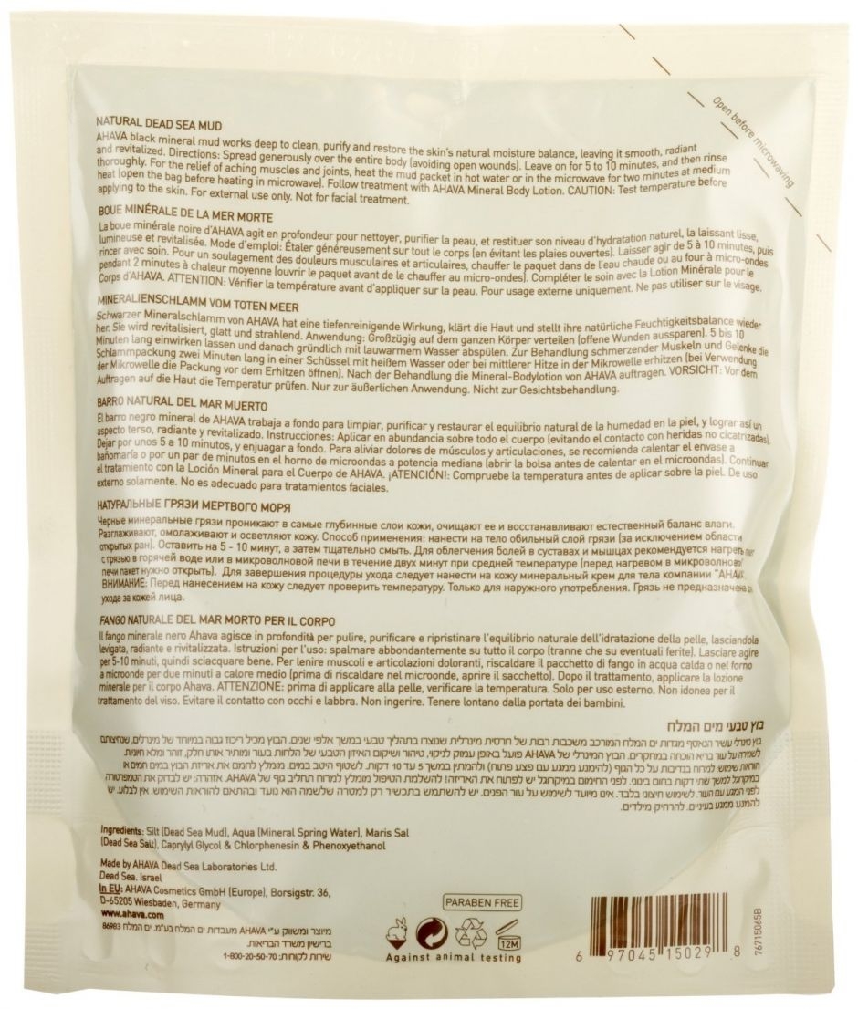 Черная минеральная грязь Мертвого моря от Ahava обладает высоко очищающими свойствами – абсорбирует излишки себума, удаляет мертвые клетки, грязь и токсины, делая текстуру кожи свежей и мягкой. Грязь является идеальным природным лечебным средством, рекомендуется для снятия боли в суставах и боли в мышцах.