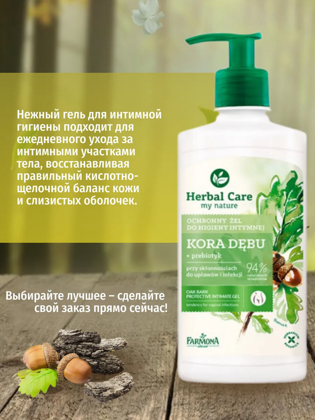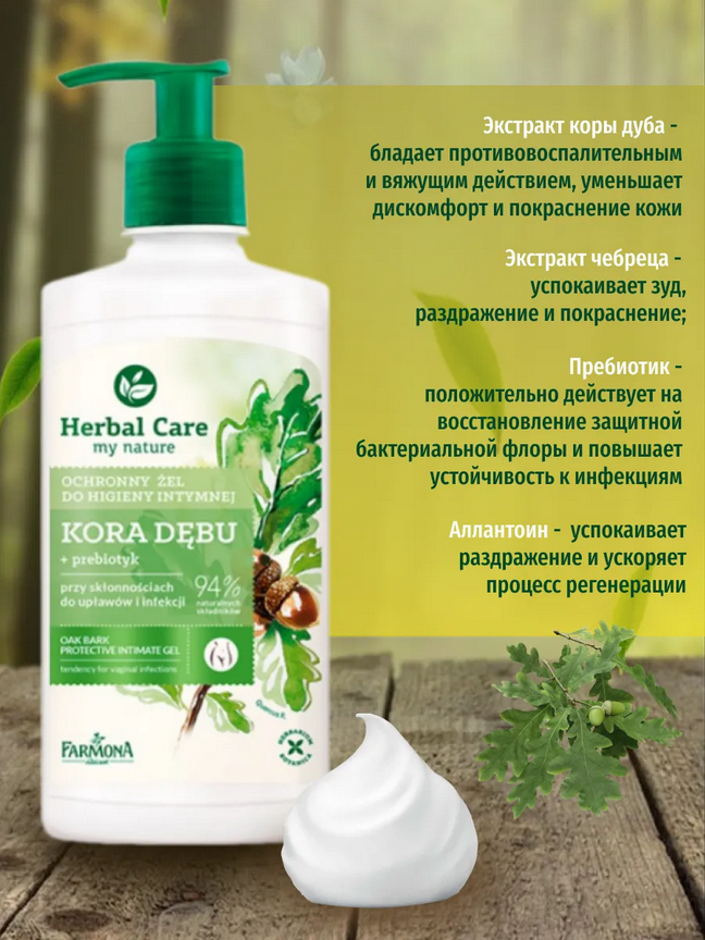 Нежный гель для интимной гигиены подходит для ежедневного ухода за интимными участками тела, восстанавливая правильный кислотно-щелочной баланс кожи и слизистых оболочек. Экстракт коры дуба обладает противовоспалительным и вяжущим действием, уменьшает раздражение и покраснение.