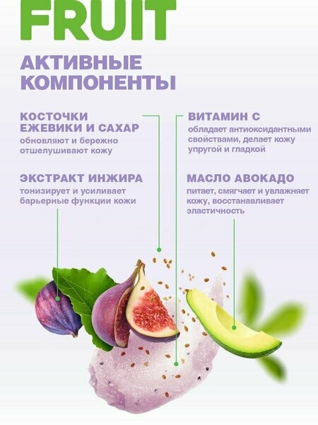 Скраб-джем на основе сочетания инжира и авокадо бережно очищает и обеспечивает мягкое и нежное отшелушивание, не раздражая кожу.