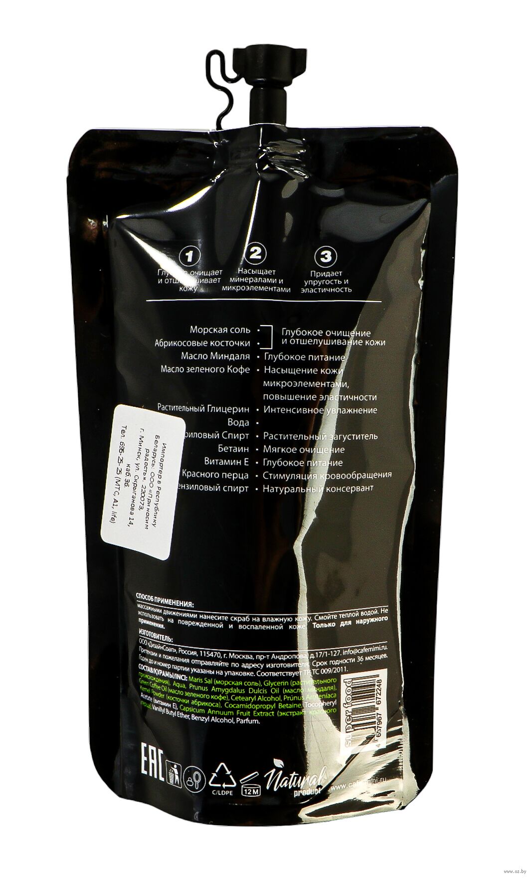 Maris (Sea) Salt (Морская Соль), Prunus Amygdalus Dulcis (Sweet Almond) Oil (масло Миндаля), Vegetable Glycerin (растительного происхождения), Green Coffee Oil (масло зеленого Кофе), Aqua, Cetearyl Alcohol, Prúnus Armeníaca (Apricot) Kernel Powder (косточки Абрикоса), Tocopheryl Acetate (витамин Е), Vanillyl Butyl Ether, Parfume, Potassium Sorbate, Sodium Benzoate.