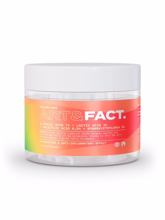 Формула пропитывающей сыворотки пилинг-пэдов с профессионально низким значением pH оказывает не только кератолитический, но и противовоспалительный эффект, что позволяет избежать высыпаний, нагноений и покраснений на различных участках тела. Регулярное использование пилинг-пэдов обеспечивает гладкую кожу без шелушений и вросших волос после депиляции. Салициловая, молочная и гликолевая кислоты препятствуют образованию гиперкератоза – главной причины врастания волоса. А сок алоэ, мочевина и гиалуроновая кислота увлажняют кожу.