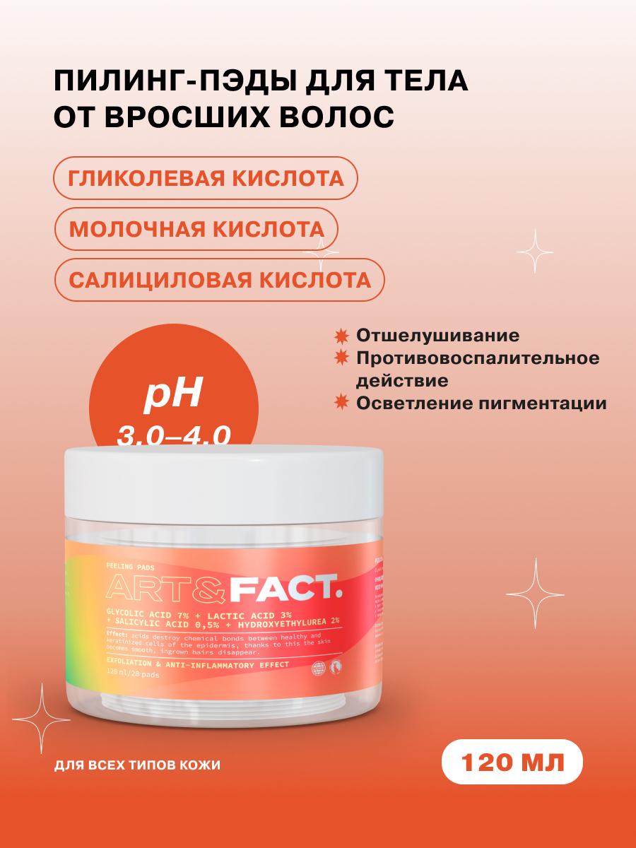 Отшелушивающие пилинг-пэды для тела от вросших волос с гликолевой кислотой 7%, молочной кислотой 3%, салициловой кислотой 1% и мочевиной 2%.