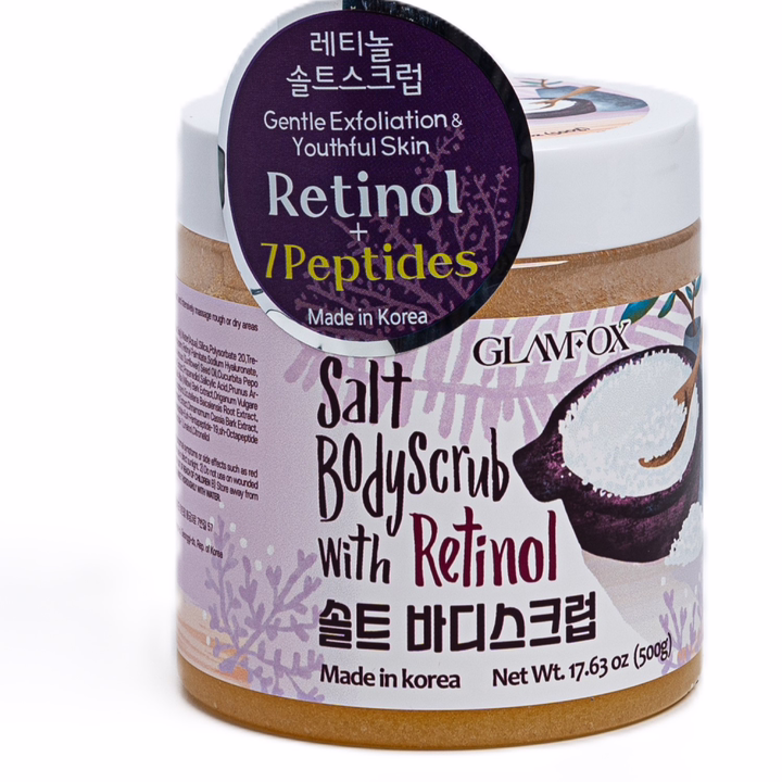 Восстанавливающий скраб GLAMFOX Salt Body Scrub with Retinol для тела с ретинолом и пептидами, разработанный для глубокого очищения и интенсивного ухода за кожей.