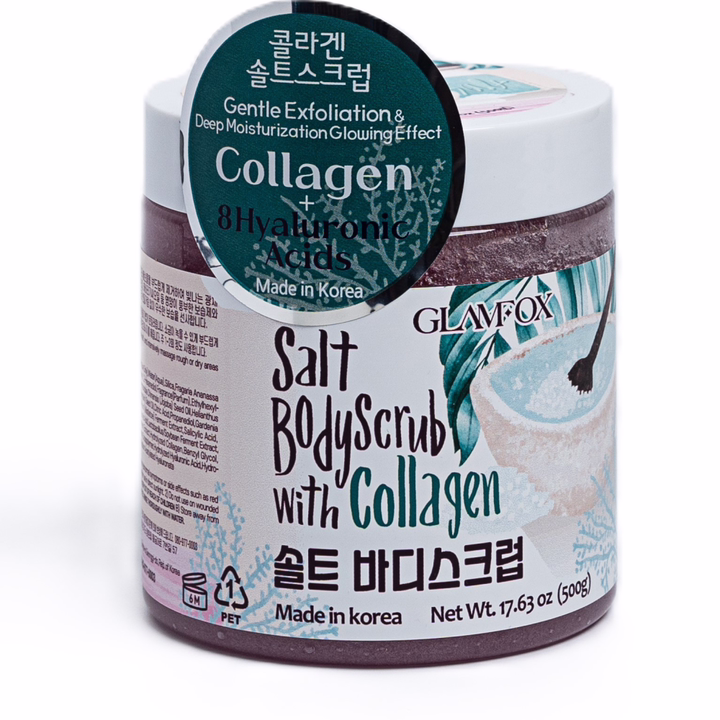 Укрепляющий скраб для тела с коллагеном и гиалуроновой ксилотой GLAMFOX Salt Body Scrub with Collagen, который нежно отшелушивает ороговевшие клетки и одновременно глубоко питает кожу.
