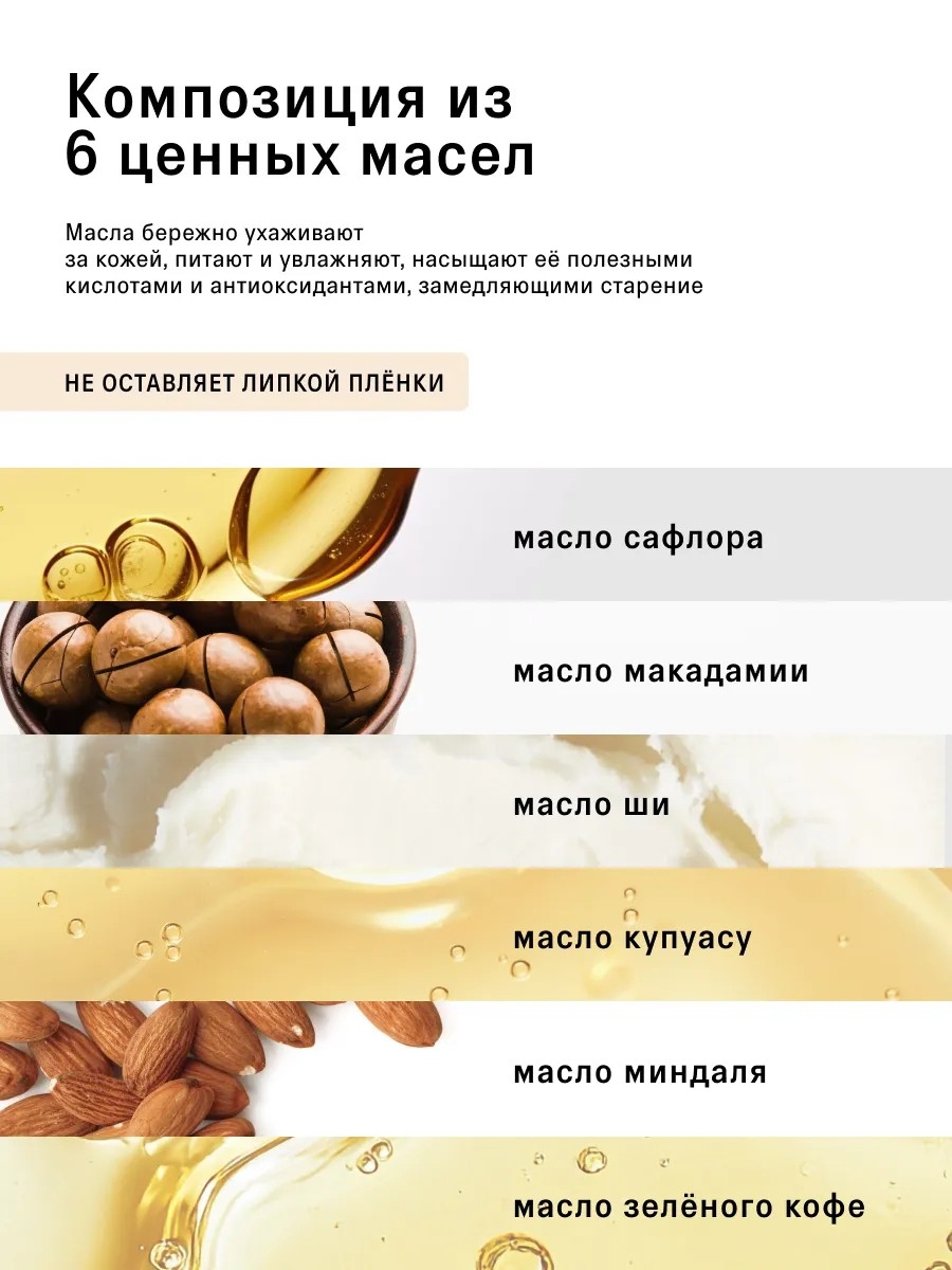 Масла Ши, кофе, миндаля и макадамии оказывают регенерирующее действие, питают и увлажняют кожу, а алое и витамин Е успокаивают и восстанавливают барьерные функции кожи.