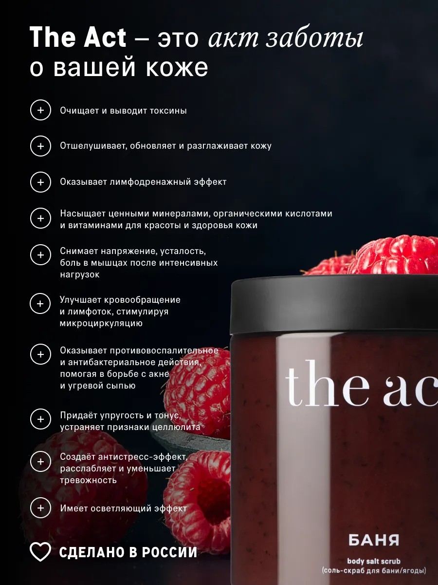 Состав с тремя видами соли и ягодной пудрой малины и клубники благотворно влияет на кожу: глубоко очищает и обновляет, оказывает лимфодренажный эффект, снимает общее напряжение в мышцах, превращая процедуру в ритуал расслабления и эмоционального перерождения.