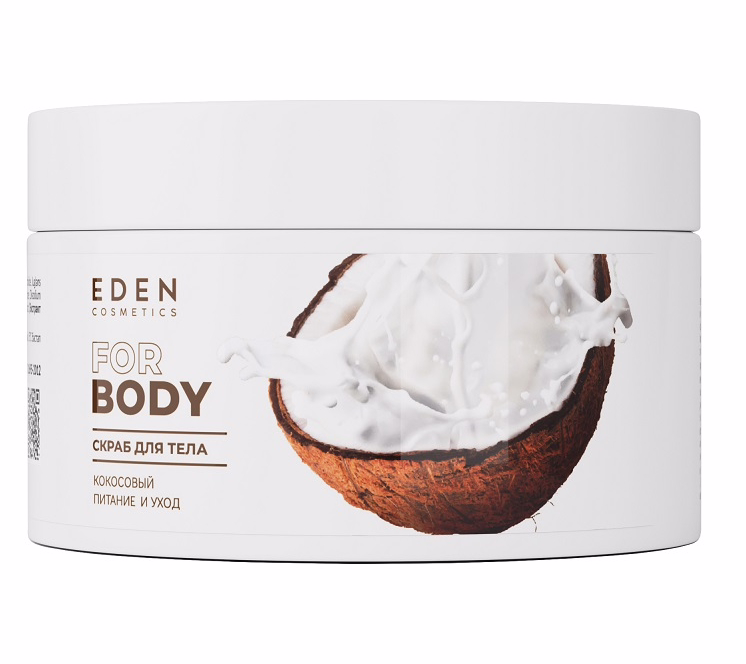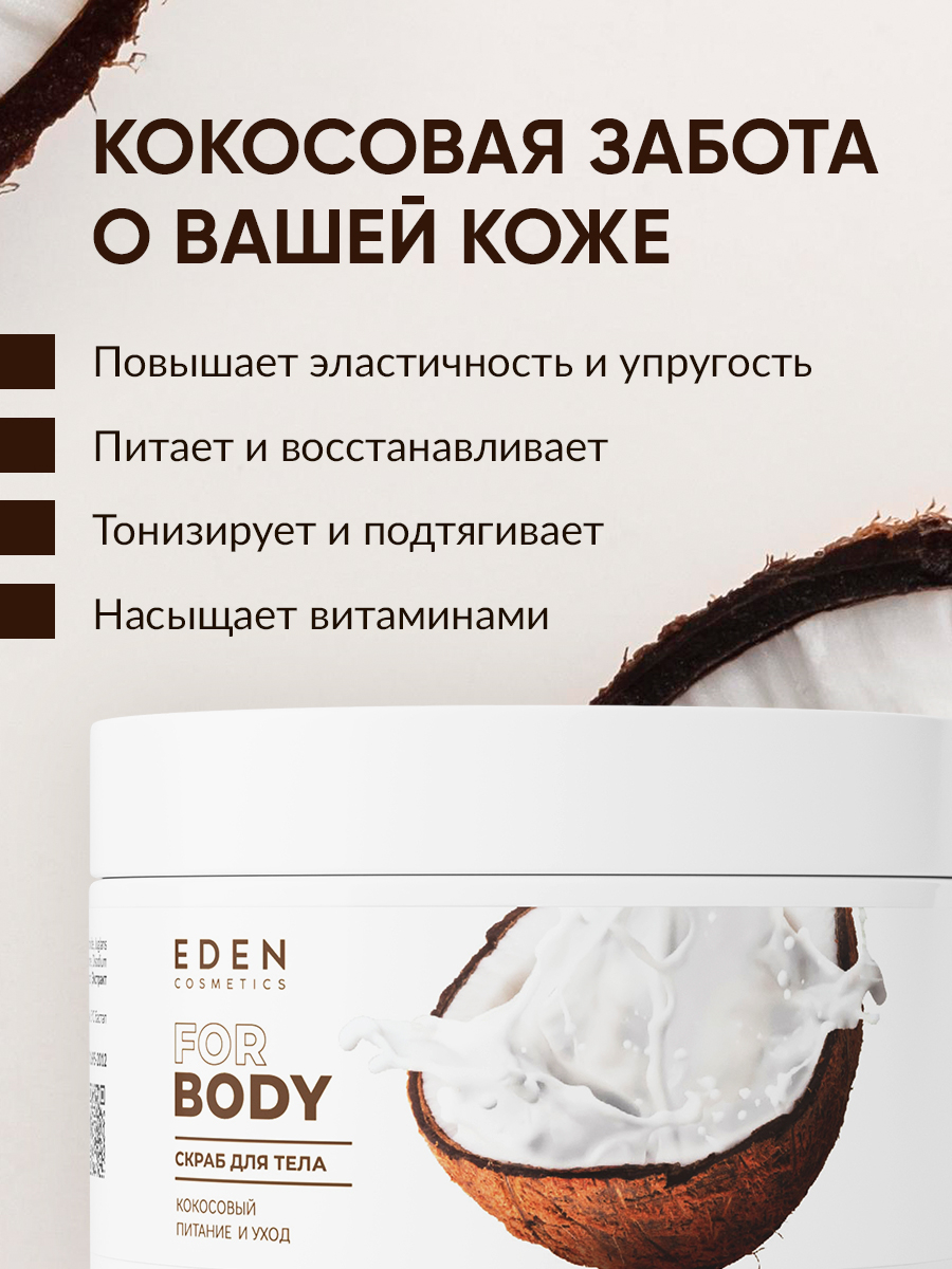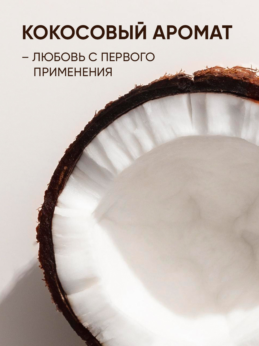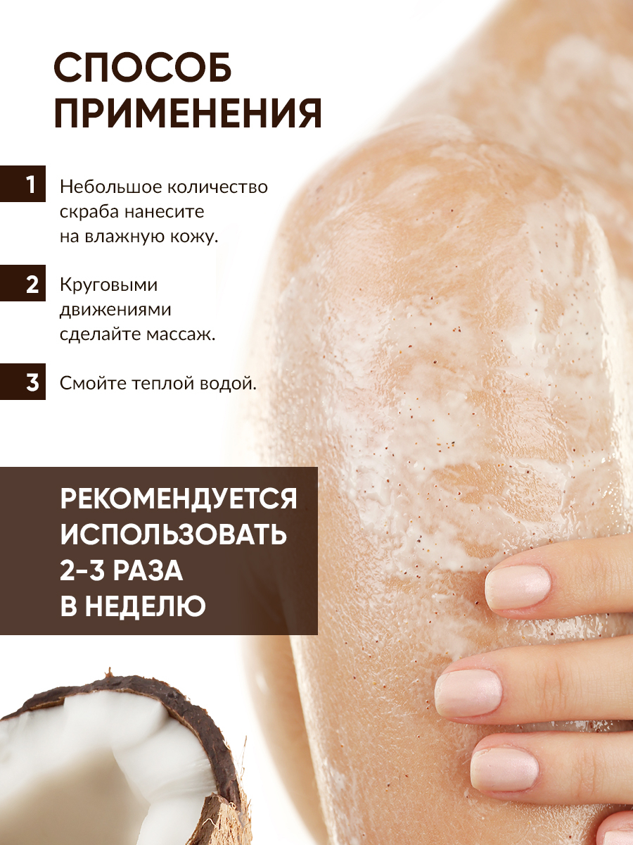 Скраб для тела с привлекательным ароматом кокоса отшелушивает и очищает кожу от омертвевших клеток, делая её мягкой и бархатистой.