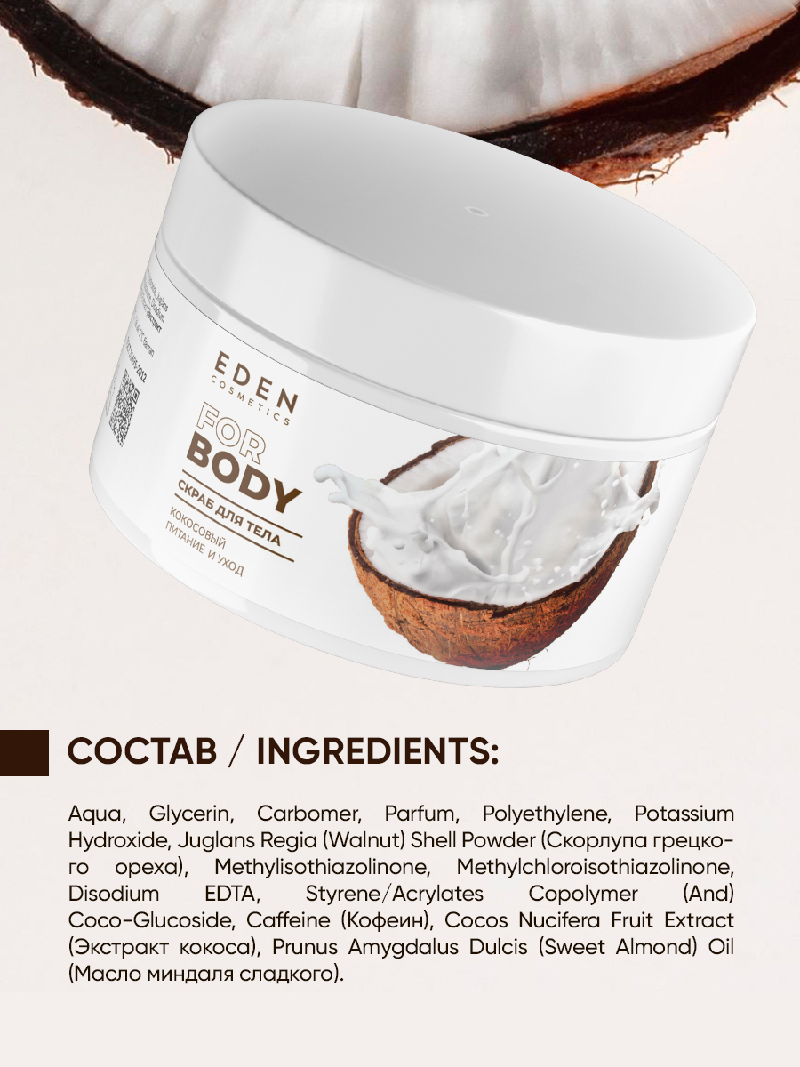 Aqua, Glycerin, Carbomer, Parfum, Polyethylene, Potassium Hydroxide, Juglans Regia (Walnut) Shell Powder (Скорлупа грецкого ореха), Methylisothiazolinone, Methylchloroisothiazolinonе, Disodium EDTA, Styrene/Acrylates Copolymer (And) Coco-Glucoside, Caffeine (Кофеин), Cocos Nucifera Fruit Extract (Экстракт кокоса), Prunus Amygdalus Dulcis (Sweet Almond) Oil (Масло миндаля сладкого).Мы используем файлы cookie для обеспечения удобства работы с сайтом и его контакта с пользователем.