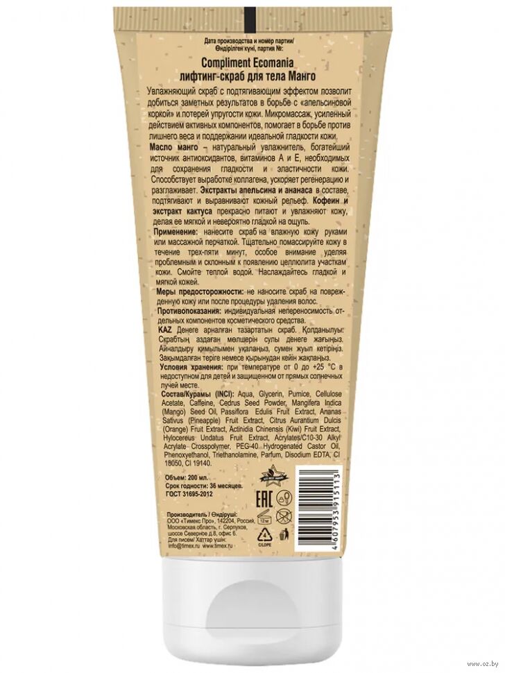 Aqua, Glycerin, Pumice, Cellulose Acetate, Caffeine, Cedrus Seed Powder, Mangifera Indica (Mango) Seed Oil, Passiflora Edulis Fruit Extract, Ananas Sativus (Pineapple) Fruit Extract, Citrus Aurantium Dulcis (Orange) Fruit Extract, Actinidia Chinensis (Kiwi) Fruit Extract, Hylocereus Undatus Fruit Extract, Acrylates/C10-30 Alkyl Acrylate Crosspolymer, PEG-40 Hydrogenated Castor Oil, Phenoxyethanol, Triethanolamine, Parfum, Disodium EDTA, CI 18050, CI 19140.Мы используем файлы cookie для обеспечения удобства работы с сайтом и его контакта с пользователем.