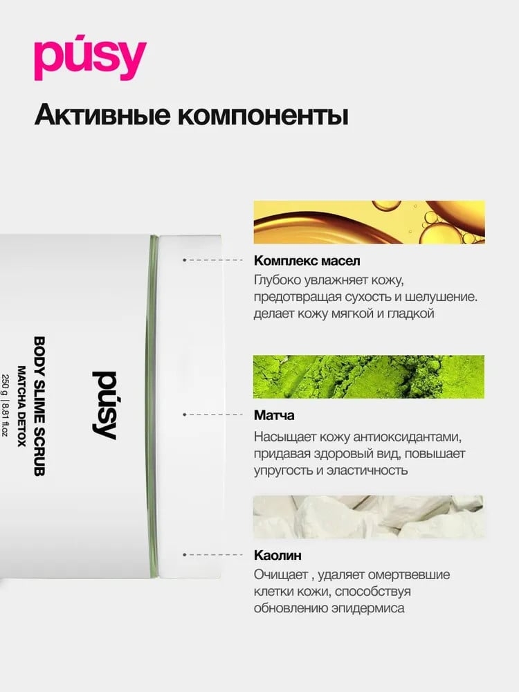 Благодаря каолину и глицерину скраб мягко удаляет загрязнения и увлажняет, а матча насыщает кожу антиоксидантами, способствуя очищению и обновлению.