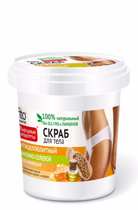 Интенсивный скраб на основе морской соли помогает эффективно бороться с целлюлитом, а свежий аромат лимона заряжает отличным настроением! Скраб выравнивает кожу, устраняет несовершенства и эффект апельсиновой корки, ускоряет обменные процессы, способствует выведению токсинов, глубоко очищает и тонизирует кожу. Мед смягчает и устраняет сухость, очищает поры, делает кожу гладкой и бархатистой. Лимонный сок повышает эластичность и упругость, ускоряет процессы обновления кожи и возвращает ей тонус. Горчичное масло обладает сильным антиоксидантным свойством, способствует расщиплению подкожного жира и улучшению контуров тела.
