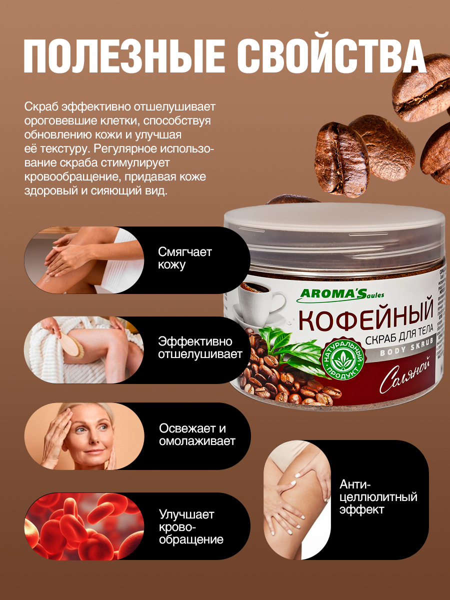 Скраб для тела соляной "Кофейный" содержит натуральную морскую соль, кофе молотый, корицу молотую, имбирь молотый, масло виноградной косточки.
