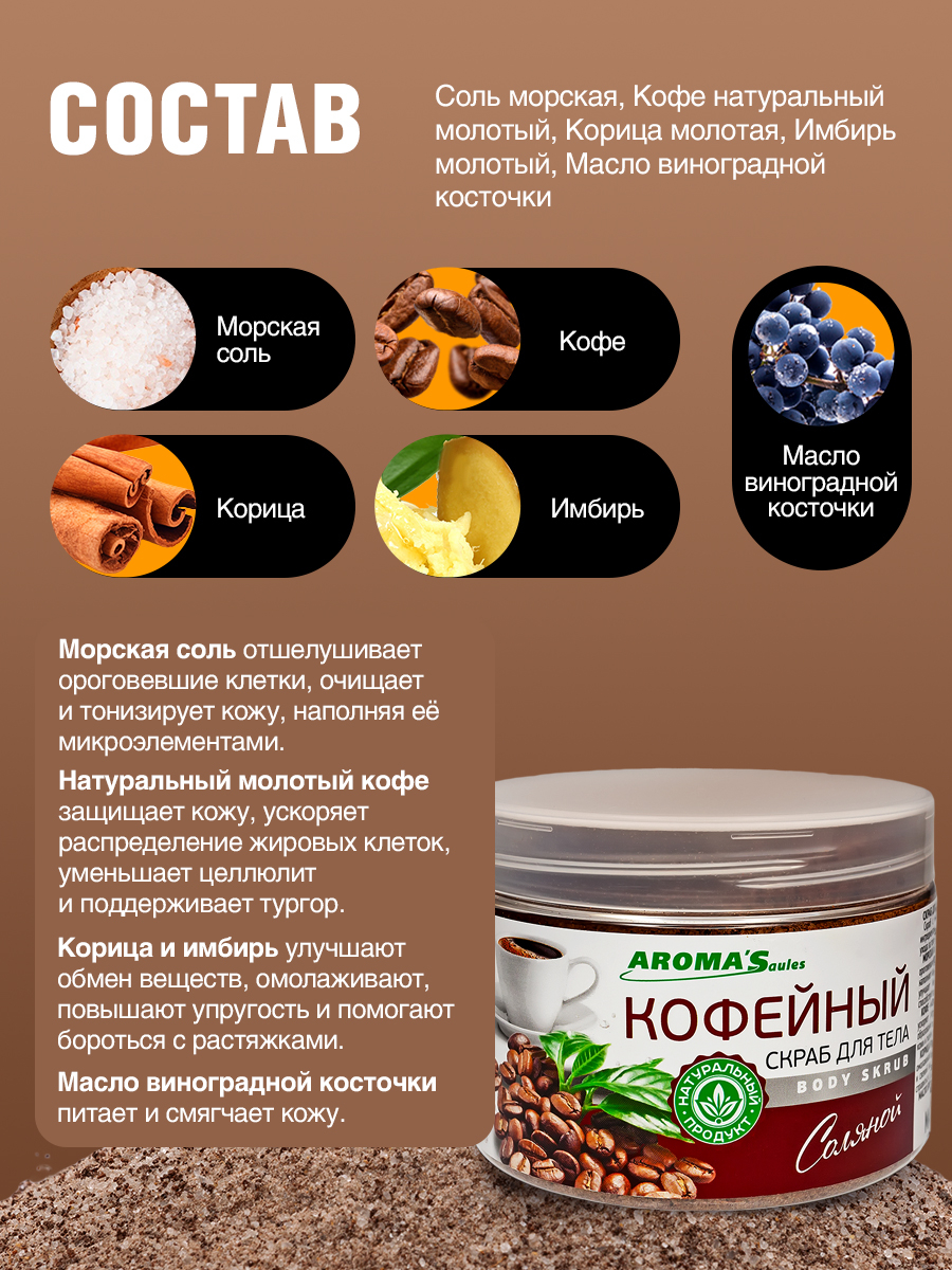 Соль морская натуральная, кофе молотый, корица молотая, имбирь молотый, масло виноградной косточки.