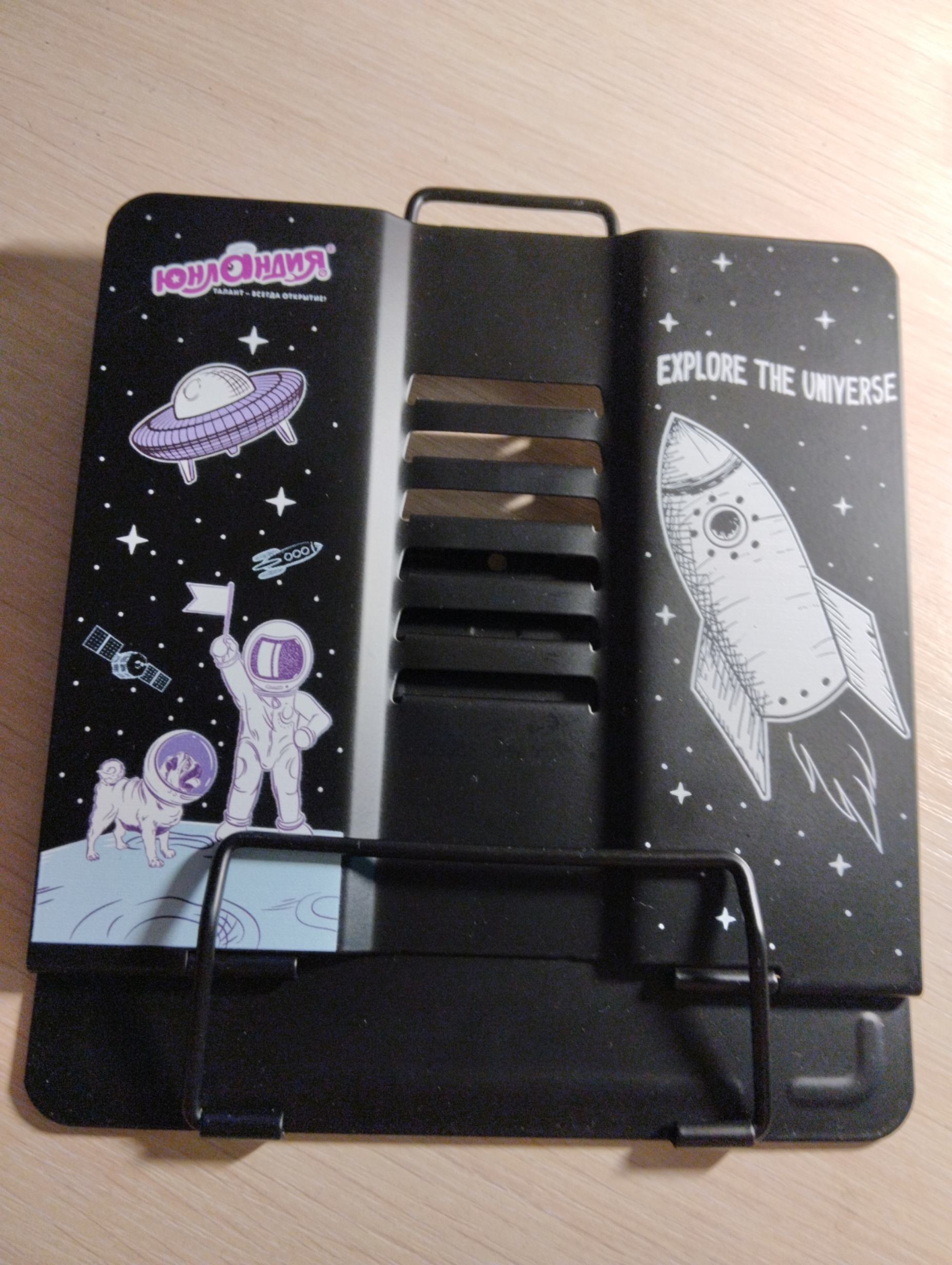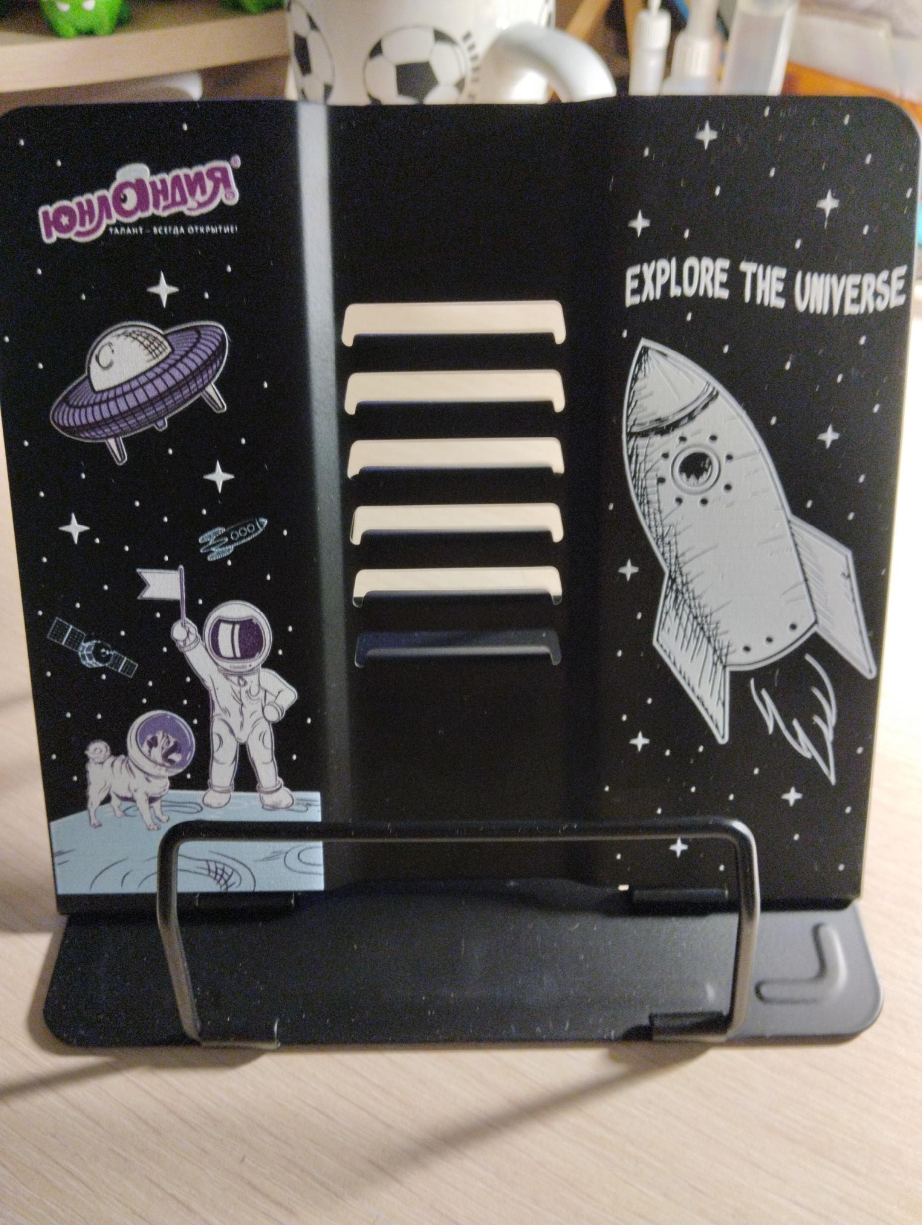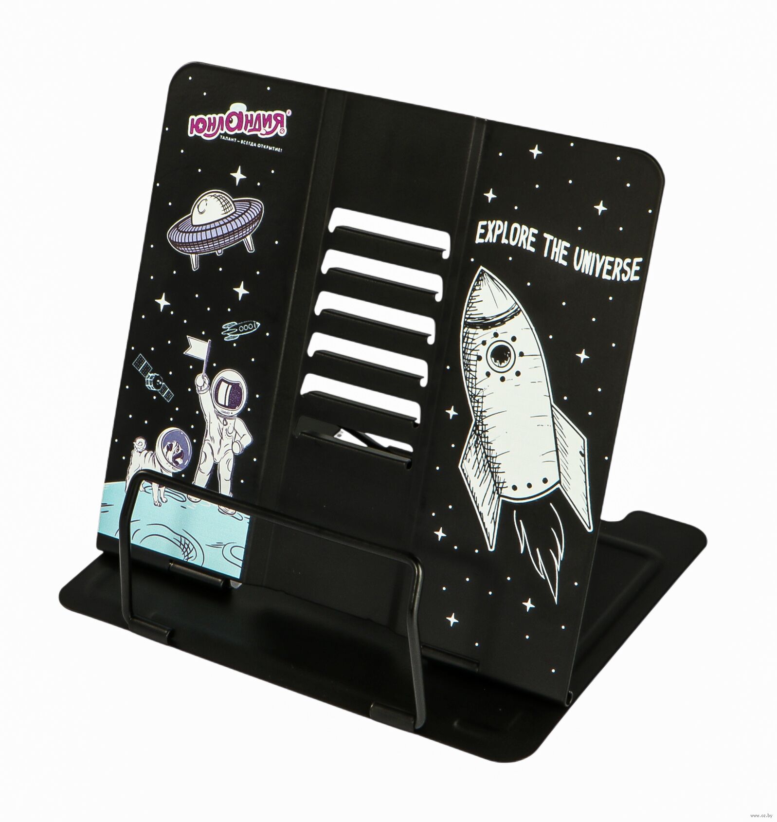 Подставка полностью изготовлена из металла, поэтому отлично подойдет для надежной фиксации тяжелых и объемных учебных материалов и книг. Оригинальный дизайн понравится как младшим школьникам, так и школьникам среднего звена. Регулируемый угол наклона обеспечивает удобство при работе с текстом, облегчает чтение и подготовку домашней работы.