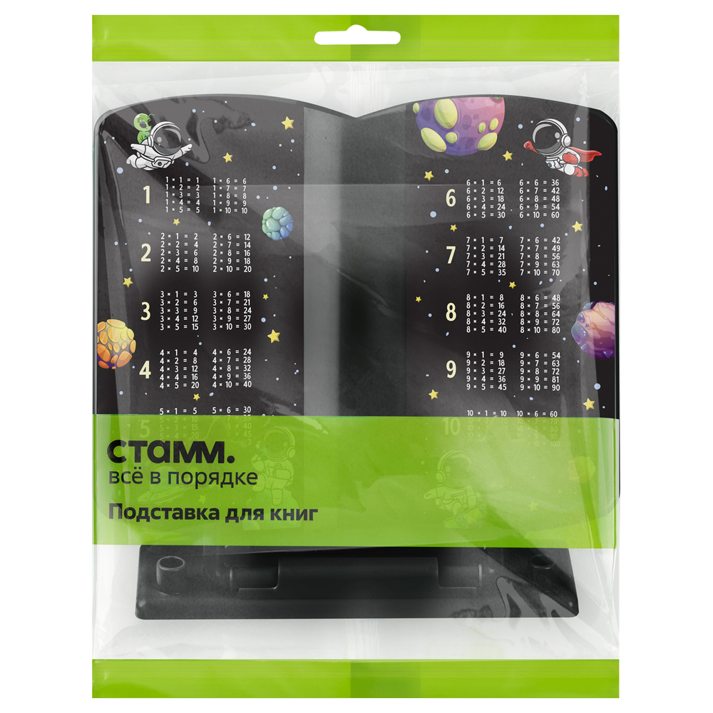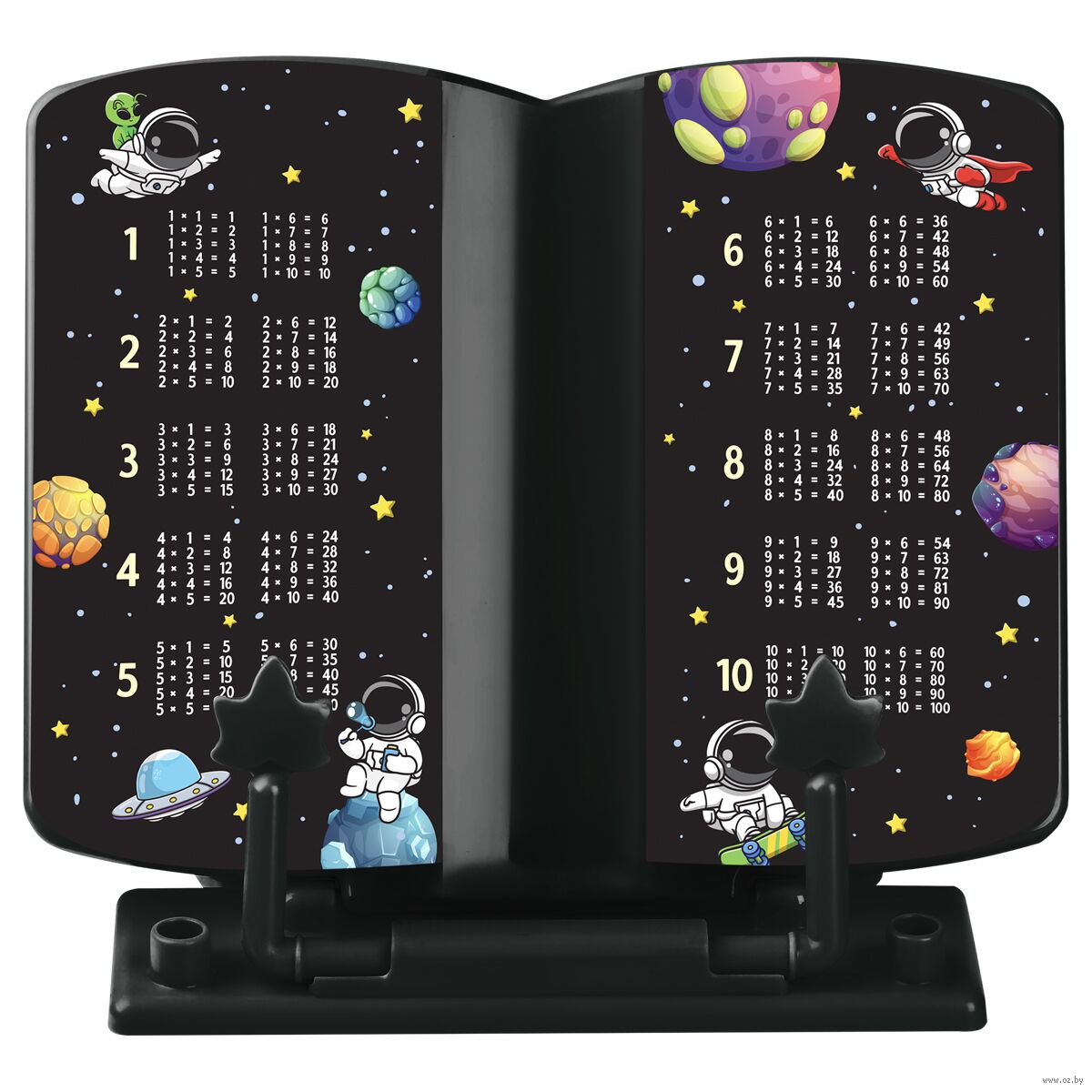 Использование подставки поможет сформировать правильную осанку. Цвет изделия – чёрный. Дизайн с космонавтами точно понравится школьникам. Его дополняет таблица умножения.