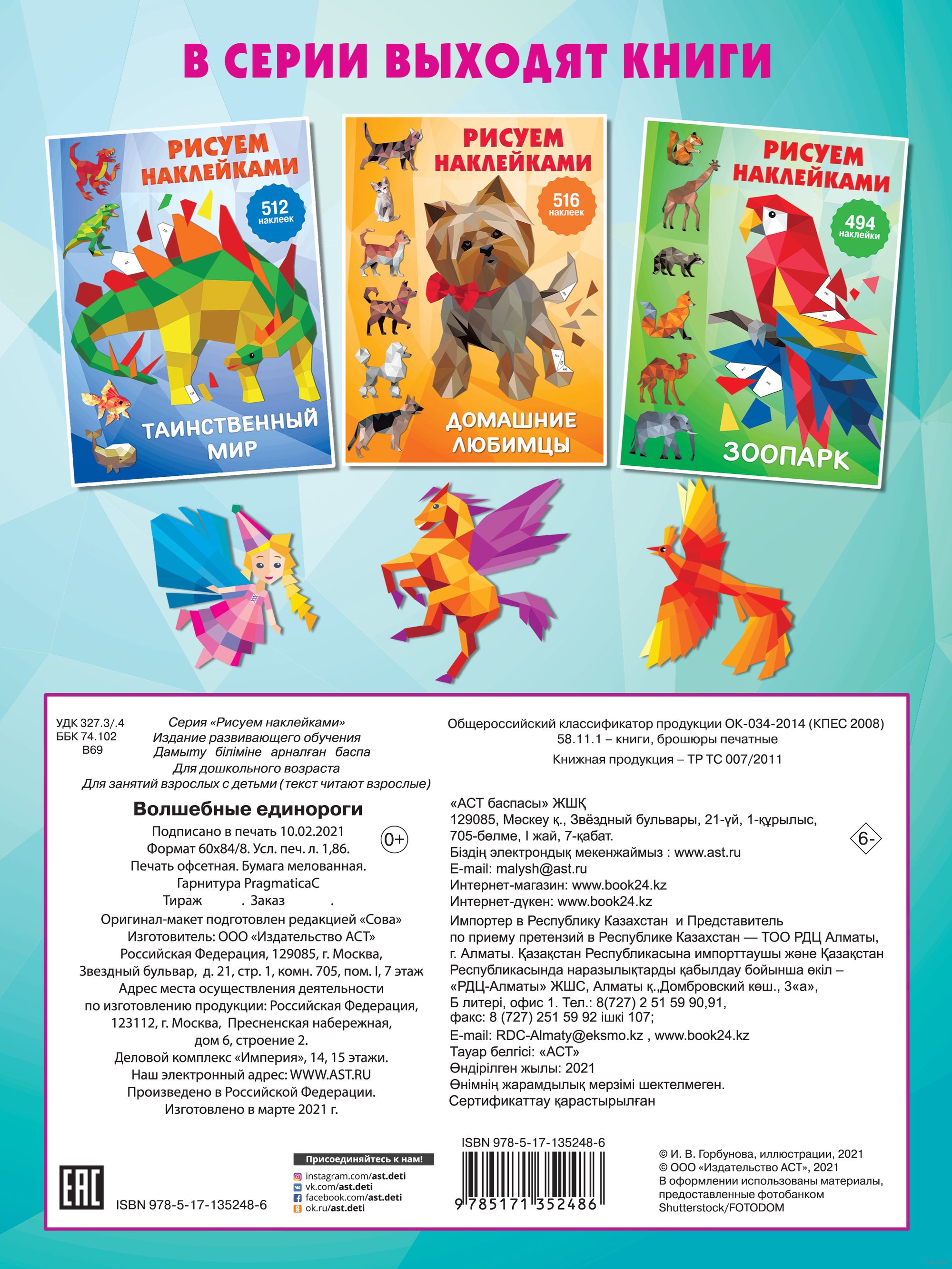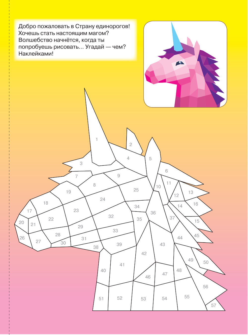 Волшебные единороги – самая необыкновенная книжка для юных художников. Это красочные иллюстрации + более 500 геометрических стикеров. Ребята узнают, что рисовать можно не только карандашами, фломастерами или красками, но и наклейками. Получаются картинки с 3D-эффектом! Достаточно подобрать наклейки по номерам. Ребёнок удивится и обрадуется, когда единороги, фея, фантастические животные и волшебный замок на страницах станут красочными и объёмными. Юным художникам обязательно понравятся интересные задания на развитие логики, памяти, внимания, мелкой моторики.
