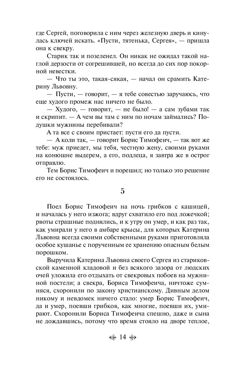 "Прозеванным гением" назвал Н. С. Лескова (1831-1895) Игорь Северянин. И правда – этого самобытного, неповторимого писателя читали меньше, чем он этого заслуживает. Его считали певцом русской удали, русского мастерства. А он ко всему этому еще изображал тайное тайных в человеке. В эту книгу вошли произведения разных периодов творчества писателя. Читатели найдут здесь и хрестоматийные рассказы, входящие в школьную программу, и остросюжетную прозу, и яркую сатиру, и истории о любви...