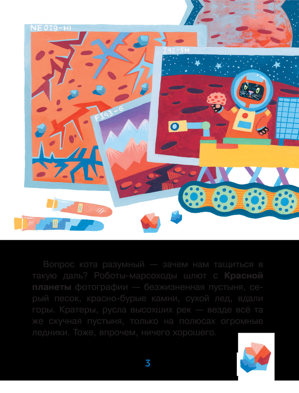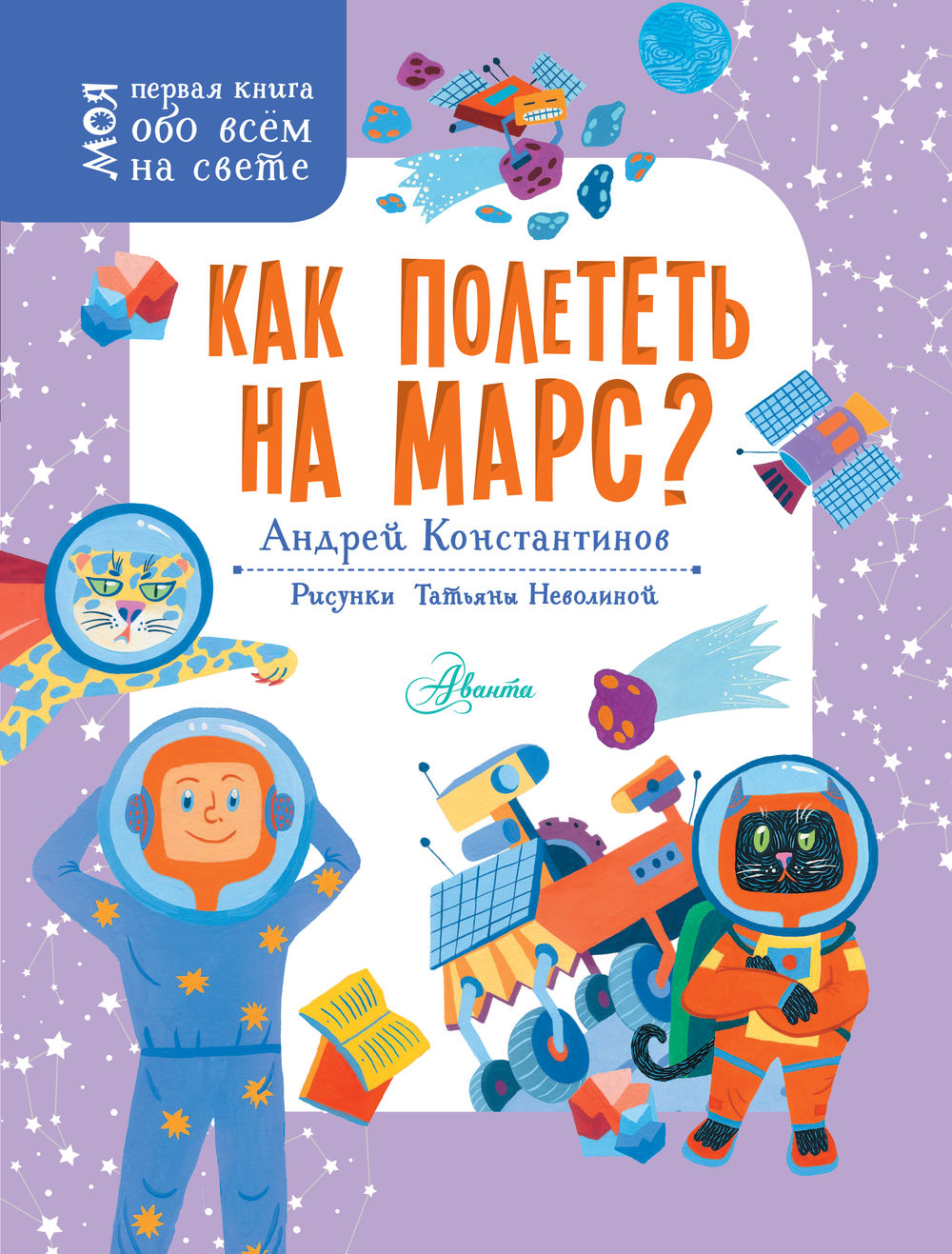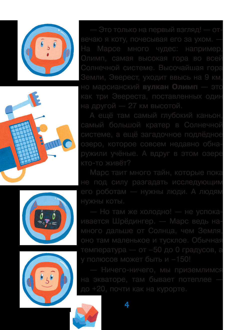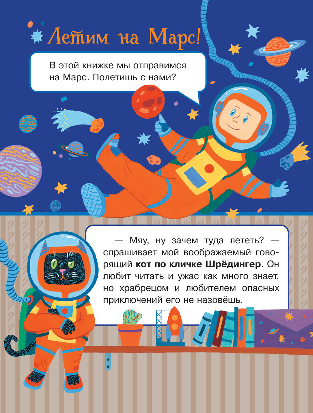 В этой книжке мы отправимся на Марс. Полетишь с нами? То есть с автором книги Андреем Константиновым и котом по кличке Шрёдингер. Он любит читать и ужас как много знает, но храбрецом и любителем опасных приключений его не назовешь. Лететь на Марс долго – целых полгода. Красная планета так далеко, что оттуда даже не позвонить – чтобы услышать марсианина, собеседнику на Земле придется ждать больше пяти минут. Зато в дороге мы поговорим о разных вещах, связанных с космосом, заглянем в Космопорт Земли, побываем на Луне, рассмотрим разные планеты и галактики, и узнаем, что нас ждет в космическом будущем.