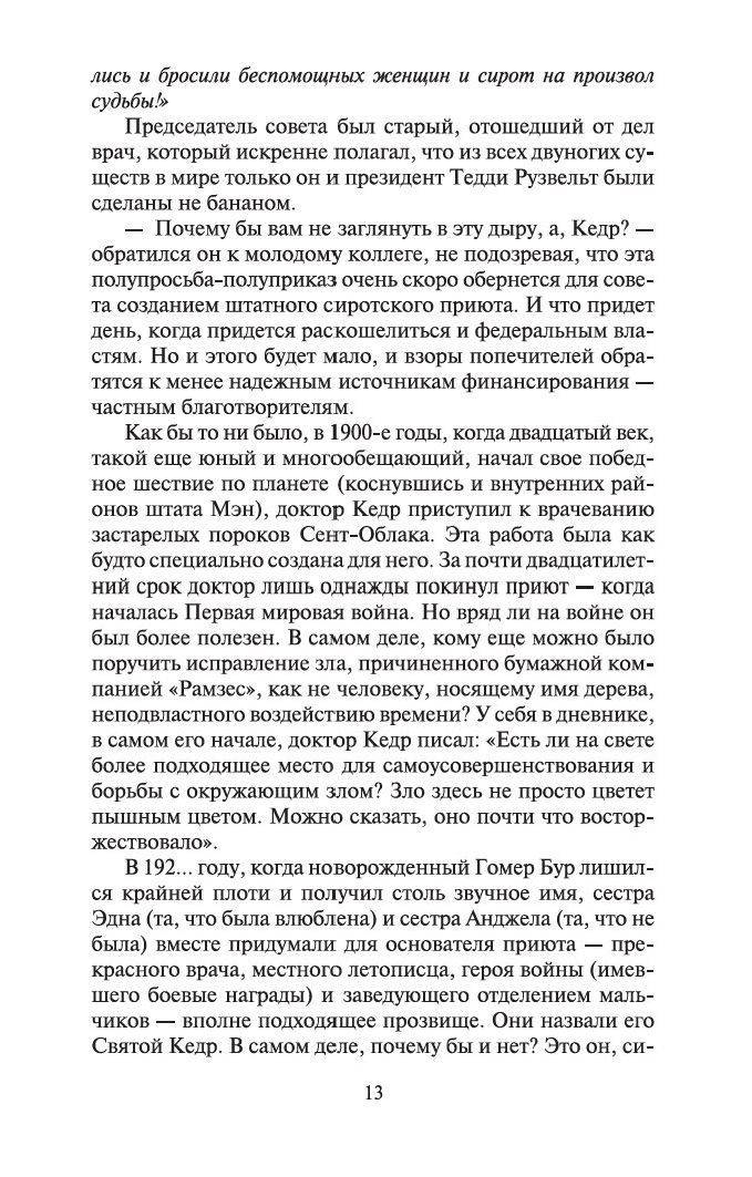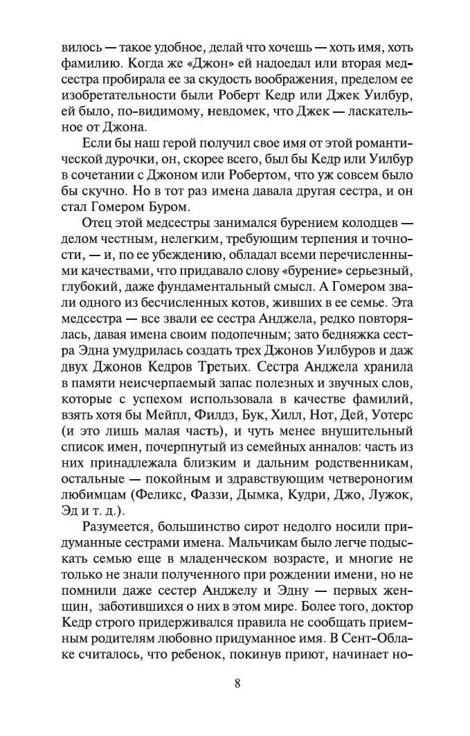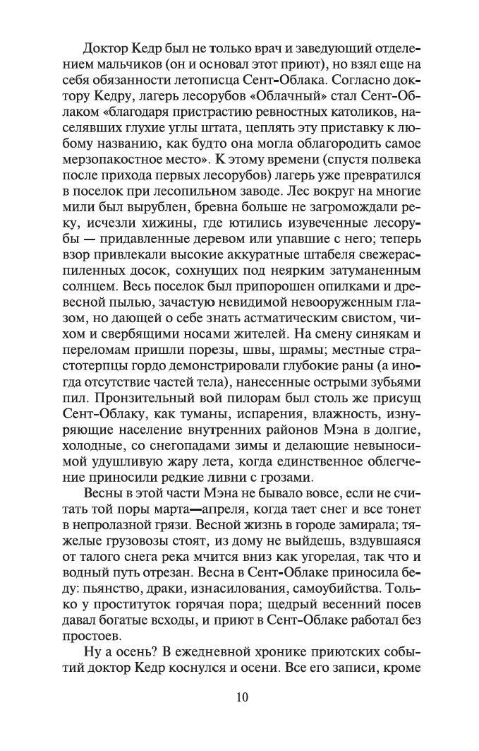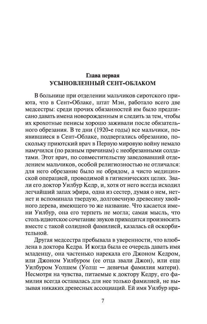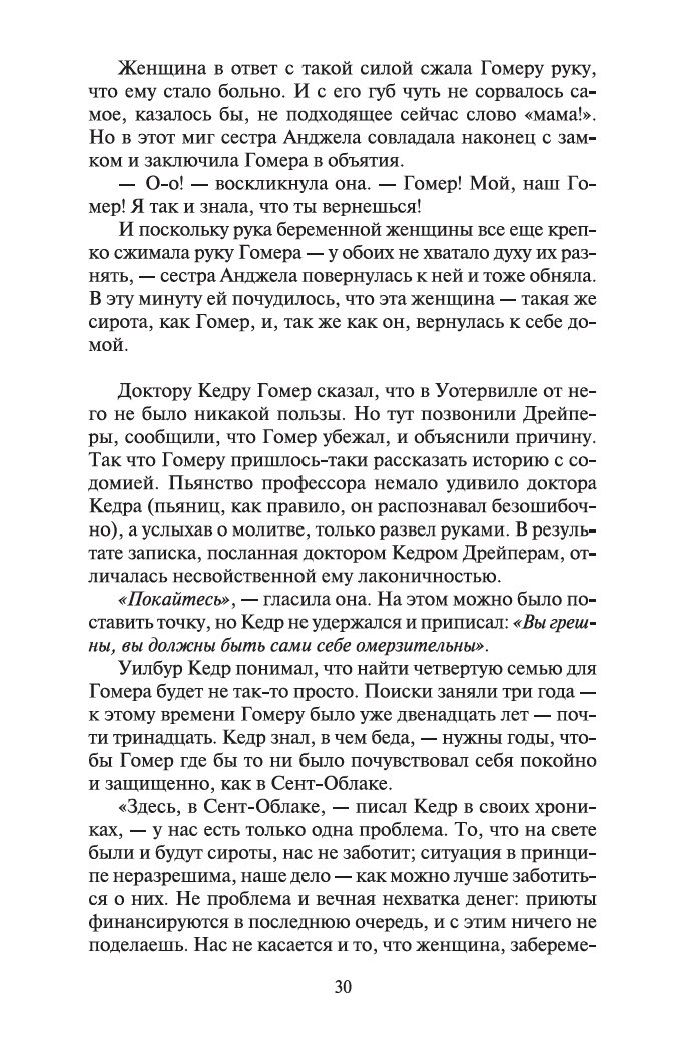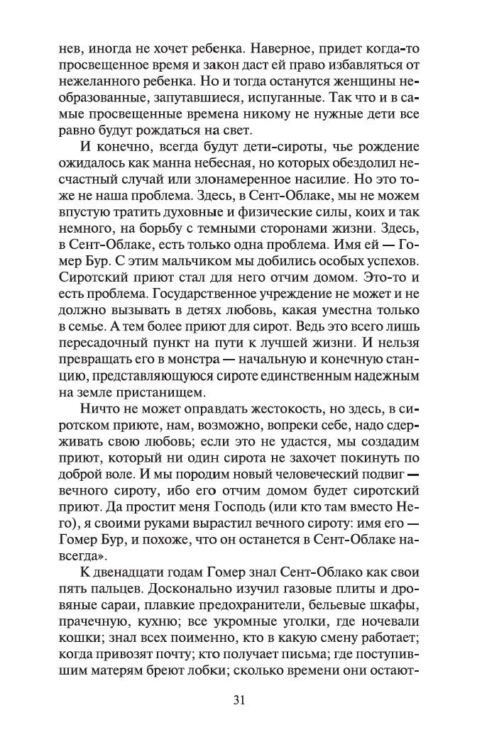 Я уже читала раньше эту книгу, воспоминания о событиях в основном стерлись, оставались только какие-то обрывки в памяти. Теперь же с большим удовольствием ее перечитала. Не могу сказать, что спустя годы книга для меня стала менее интересной. С первых страничек память возвращала забытое, а я уходила с головой в грустную, тягучую и сложную историю жизни жителей сиротского приюта, Сердечной бухты и Сердечного камня. Темы, затронутые в романе, на мой взгляд, трудные, противоречивые, личные. Рассказать о сиротах, абортах, пороках надо умело, чтобы не погрязнуть в безысходности. Среди мрака должен быть свет, среди зла найдется доля доброты, среди печали есть место юмору. У Ирвинга это отлично получилось! Здесь положительные герои совершают ошибки и нарушают правила. А отрицательные пропитаны не только грубостью, черствостью и пошлостью, в них есть и хорошее, они ищут покоя и умеют любить. Многому удалось уделить внимание автору, переплести проблемы современного общества с общечеловеческими ценностями, зацепить цели и место человека в своей собственной жизни. Сент-Облако - отдельное место на земле, где живут необыкновенные люди, преданные своей работе, верующие в свое богоугодное дело. Здесь свои правила и законы. Именно здесь и начинается история. Место, где дети сразу рождаются сиротами. Место, где женщина без огромного риска для здоровья, может сделать свой выбор. Аборт. То, что еще не признано, и считается в обществе делом дьявола. Я очень капризно отношусь к интимной теме в литературе. Меня отталкивает пошлость, слишком откровенные описания часто выглядят вульгарными в тексте и портят всё впечатление. Многим писателям так и не удалось меня в этом переубедить. Не знаю, как получилось это сделать Дж. Ирвингу, ведь тема очень личная, очень интимная, много подробностей анатомии, но нигде не было лишнего, пошлого, вульгарного. Ну, может чуть-чуть... В эпизоде с фотографией. Но и эпизод это сыграл большую роль в книге, опустить его просто некуда. Но не только Сент-Облако фигурирует в книге, есть и другие места на земле, где идет другая жизнь, и есть надежда на лучшее, только надо ждать, всегда ждать... Здесь живут разные люди. Кто-то не от хорошей жизни будет знаком с Сент-Облаком, а кто-то и никогда не слышал об этом месте. Но и здесь существуют правила, у всех свои. Попадая на чужую территорию, надо их придерживаться. Иногда это слишком жестоко. Наблюдая за судьбами героев романа, приходилось волноваться, обдумывать их поступки, не соглашаться, разочаровываться в одних и смотреть иначе на других. Никто из героев для меня не остался чужим. Даже в мелочах и небольших эпизодах проявляется характер, происходит знакомство и узнавание. Есть желание рассказать о многих полюбившихся персонажах, еще раз вспомнить их добрым словом, но и у меня свои правила, не раскрывать сюжет и отношения между героями в отзывах. Только впечатления в целом. Роман завершен. После повторного чтения оценка ниже не стала, с героями, какие бы они не были, расстаться сложно. А фильм по книге смотреть все так же не хочу. Боюсь потерять свою атмосферу, нет желания смешивать чужой взгляд со своим впечатлением.