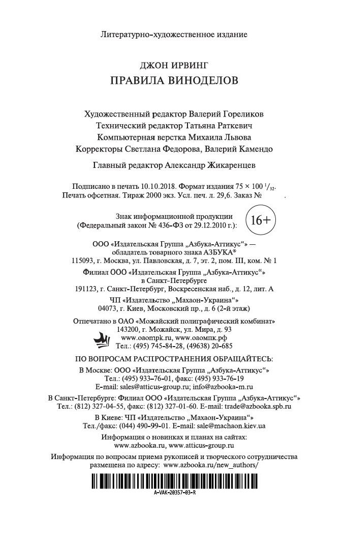 "Правила виноделов" – классическая сага о любви и выборе американского писателя Джона Ирвинга, автора таких мировых бестселлеров, как "Мир глазами Гарпа", "Молитва об Оуэне Мини", "Мужчины не ее жизни". Это книга о том, что каждый мечтает о семье, о простых жизненных правилах, которых должен придерживаться человек, если он хочет оставаться человеком. Это книга об обязательствах, которые настоящие люди берут на себя и выполняют, и о призвании, которое, как ни крути, есть у каждого в жизни, но не всякий его находит.